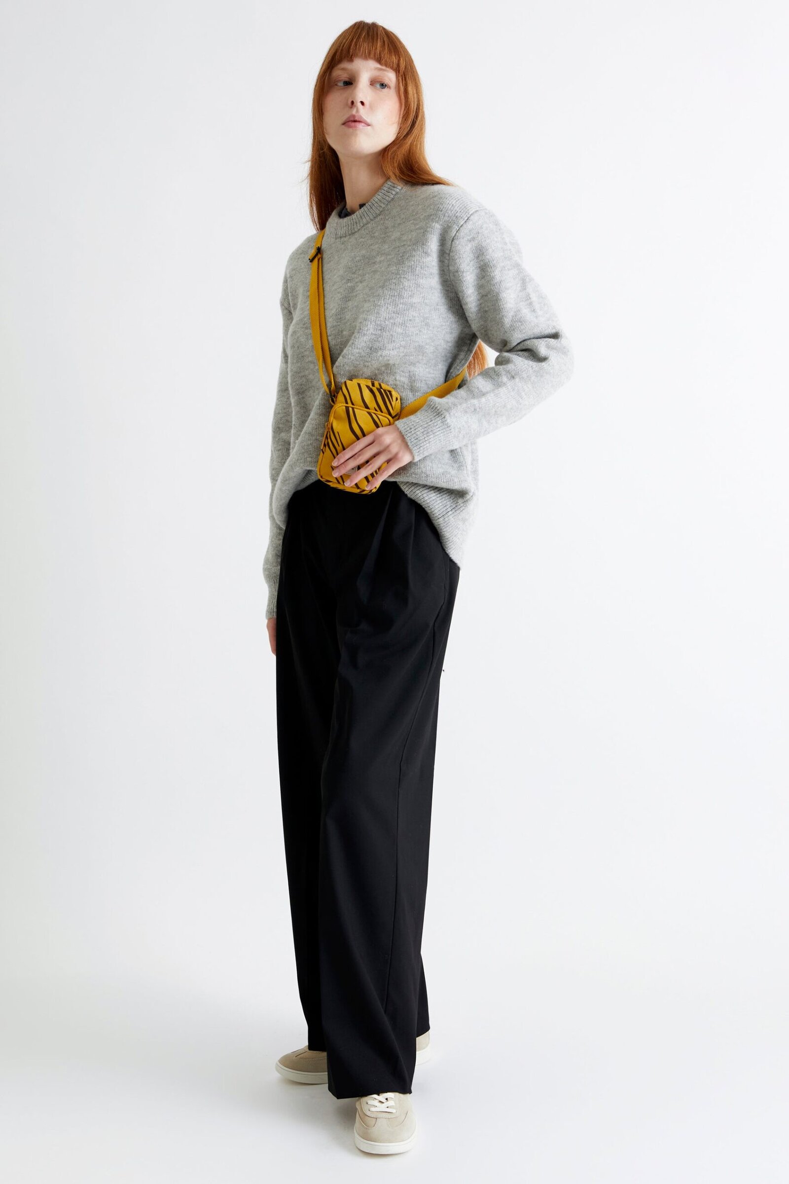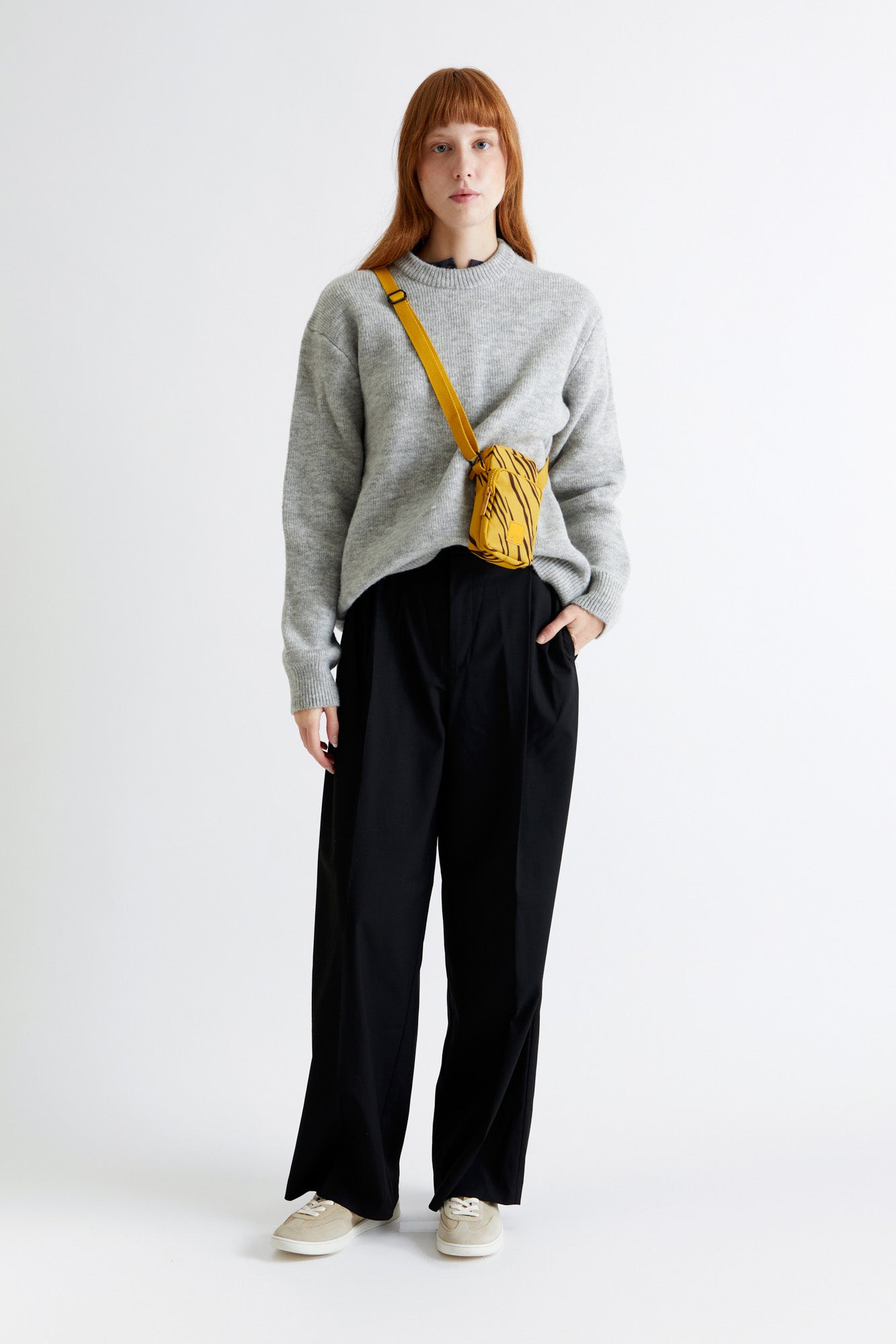 Rectangular shoulder bag to carry only the essentials. It has two separate compartments for better organisation. Holds phones up to 7″. Zipped clousure. Lightweight and adjustable cotton strap.