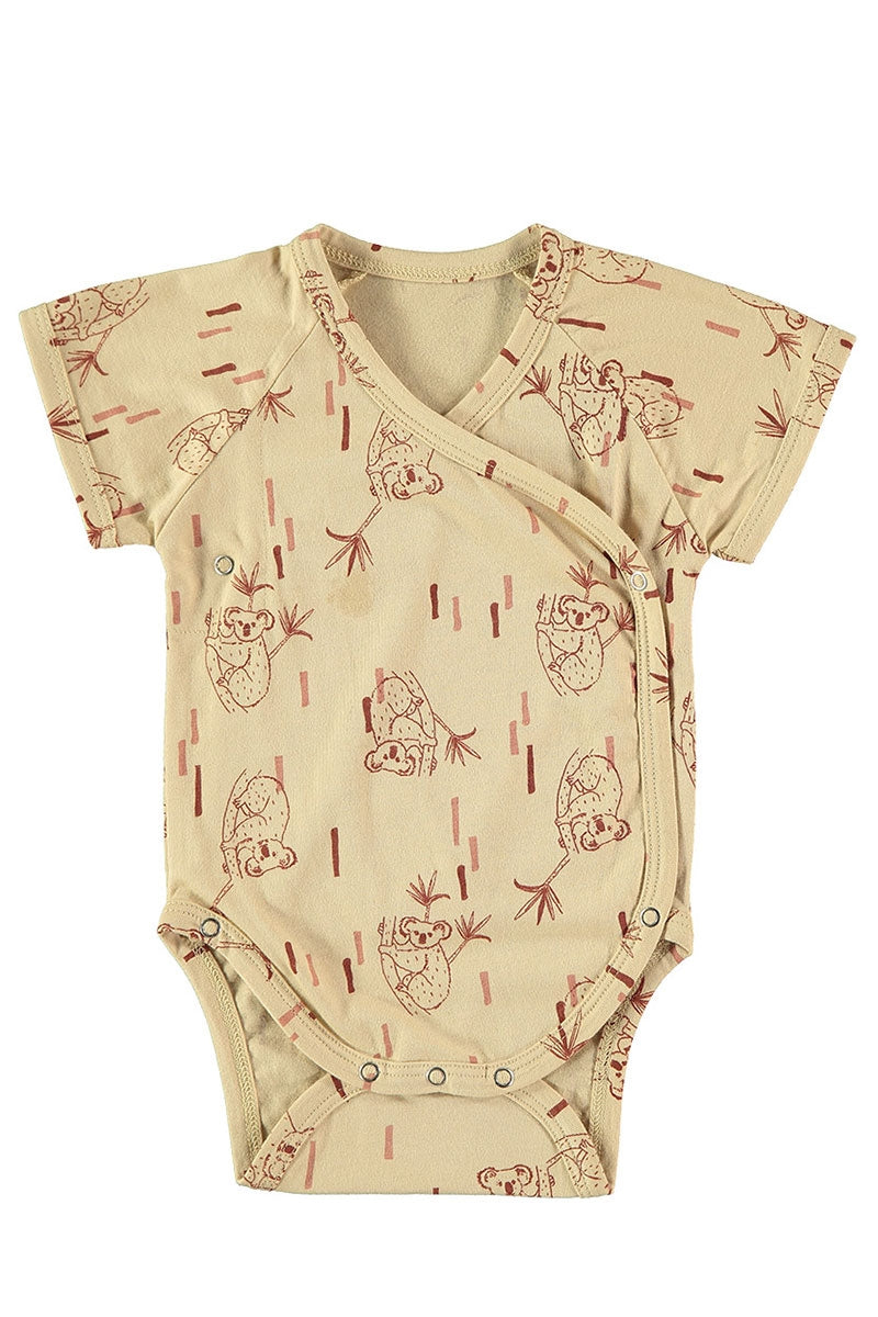 Short-sleeved jumpsuit with nickel-free clasps in the crotch to easily dress your baby. In beige with koalas print inspired by the footprint we want to leave on the Planet.