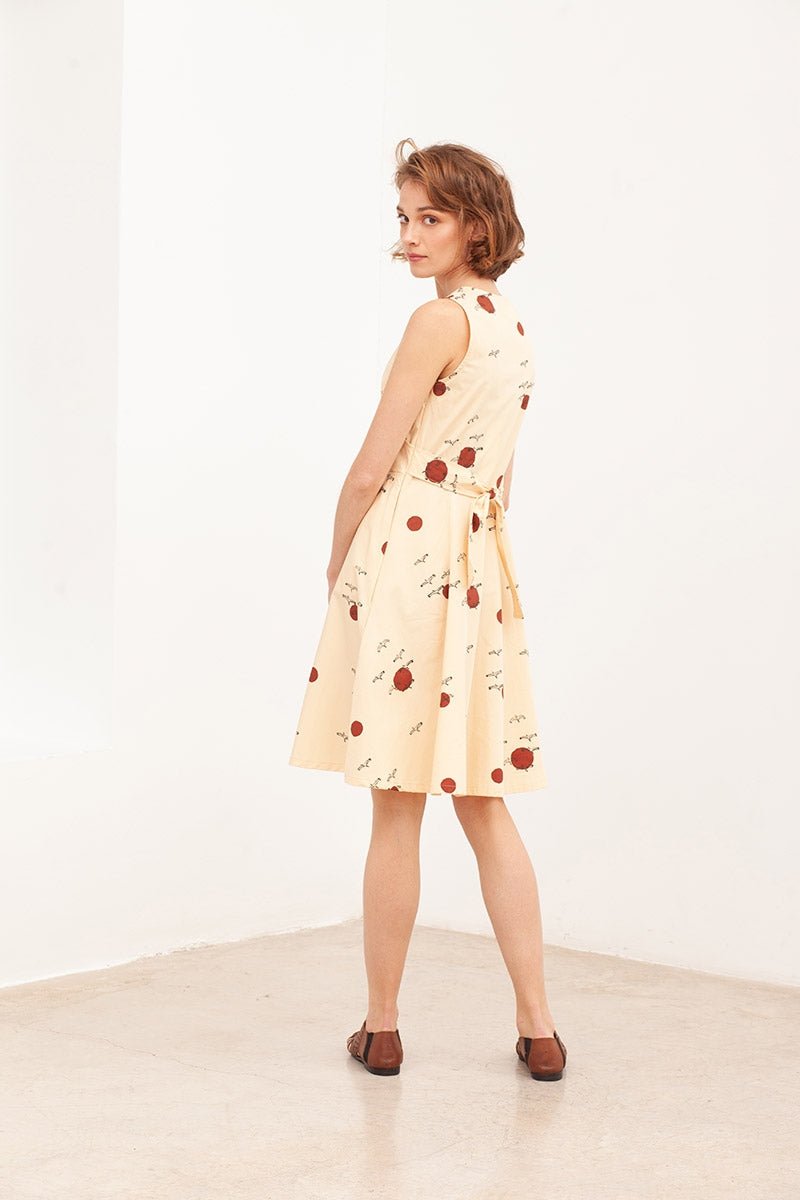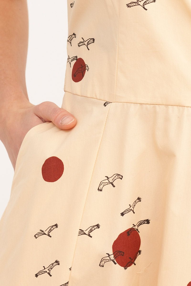 Bega is a fitted waist dress with a midi-length skirt. It has an invisible zip on the side, a ribbon to adjust the waist and side pockets; an elegant garment that enhances the silhouette. It is made from ultra cool cotton poplin fabric, giving a soft and pleasant touch to the skin. Its beige birds print, inspired by the positive Footprint we want to leave on the Planet, gives the garment that special, unique and personal touch.