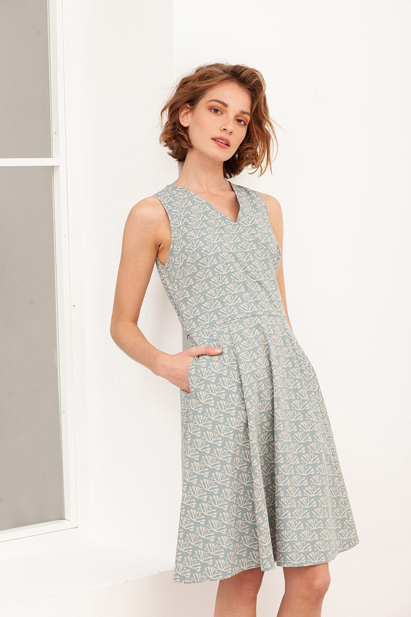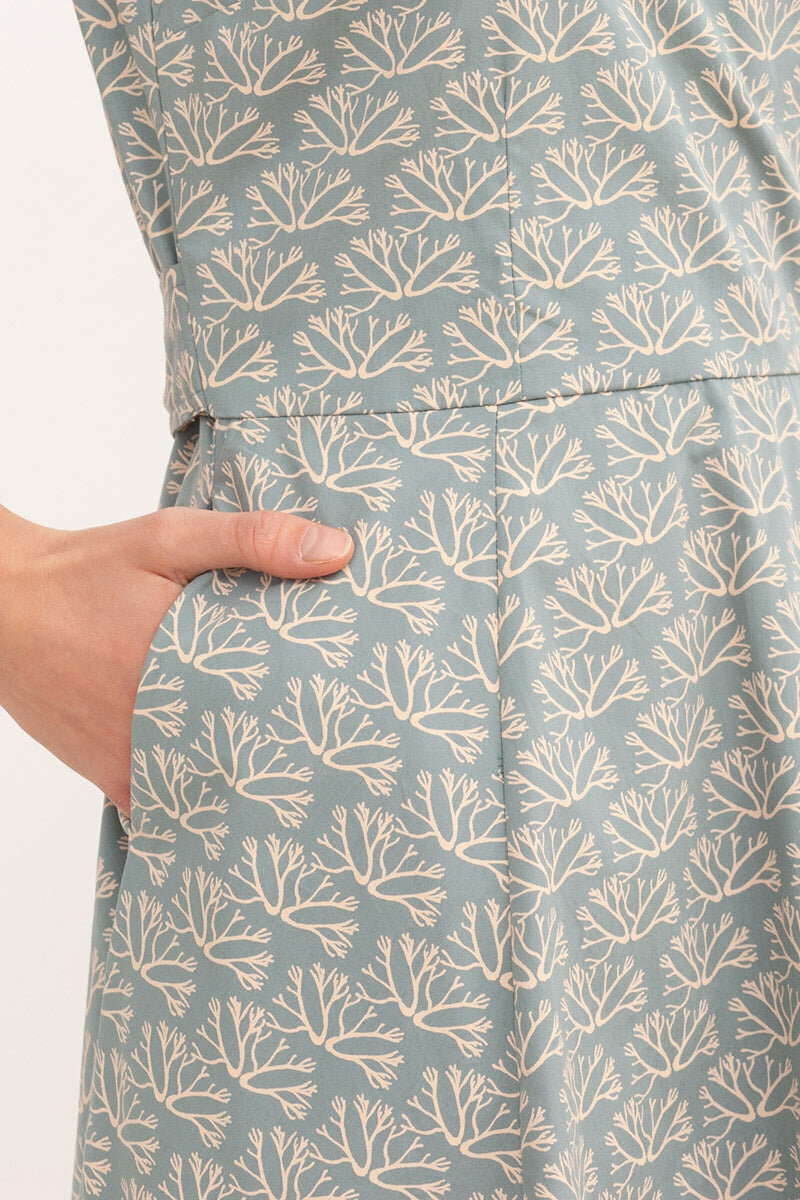 Bega is a fitted waist dress with a midi-length skirt. It has an invisible zip on the side, a ribbon to adjust the waist and side pockets; an elegant garment that enhances the silhouette. It is made from ultra cool cotton poplin fabric, giving a soft and pleasant touch to the skin. Its blue coral print, inspired by the positive Footprint we want to leave on the Planet, gives the garment that special, unique and personal touch.
