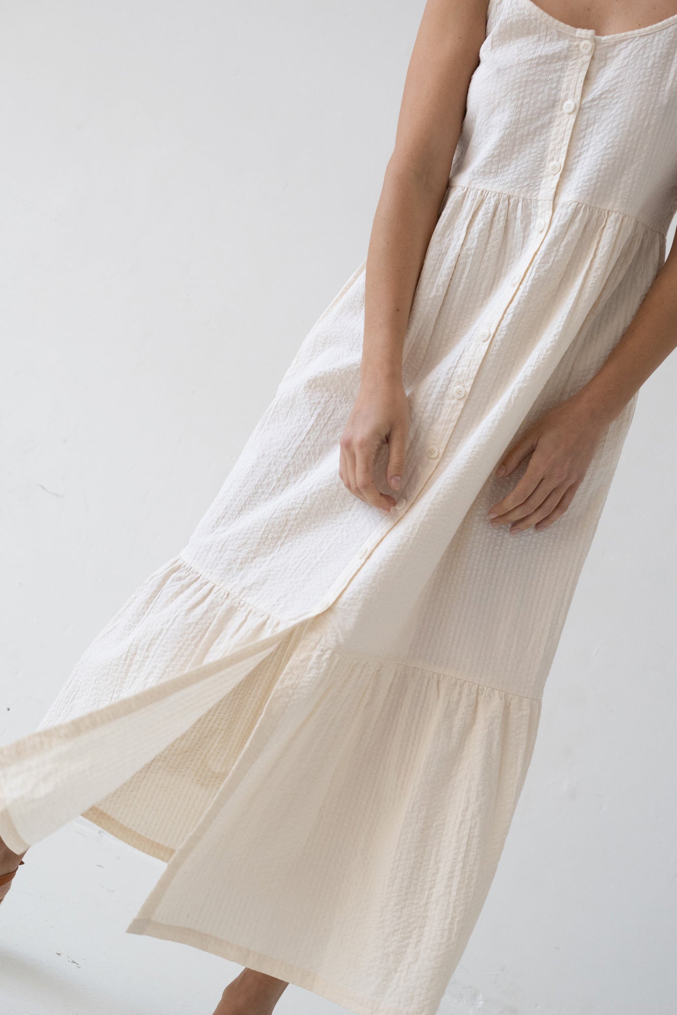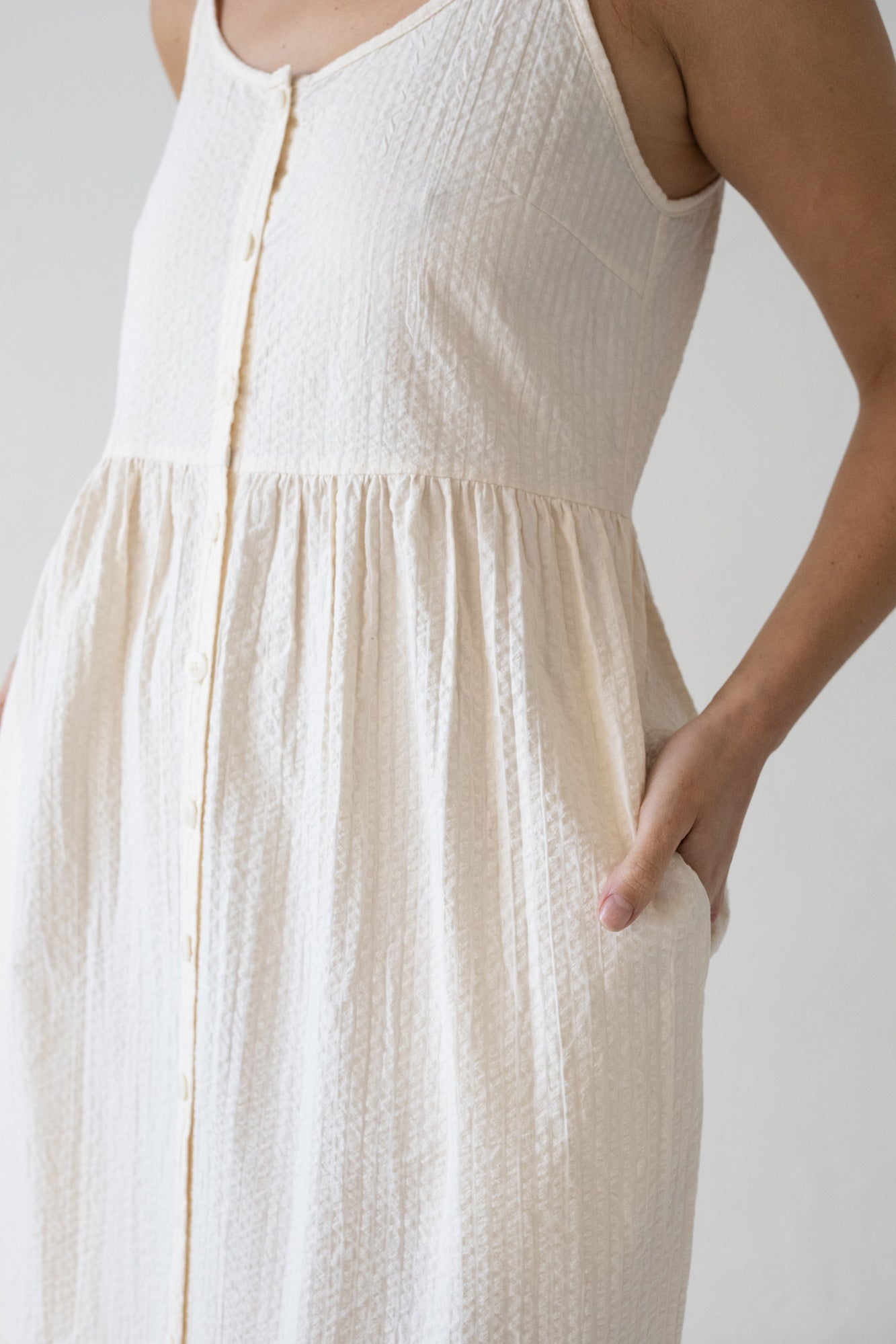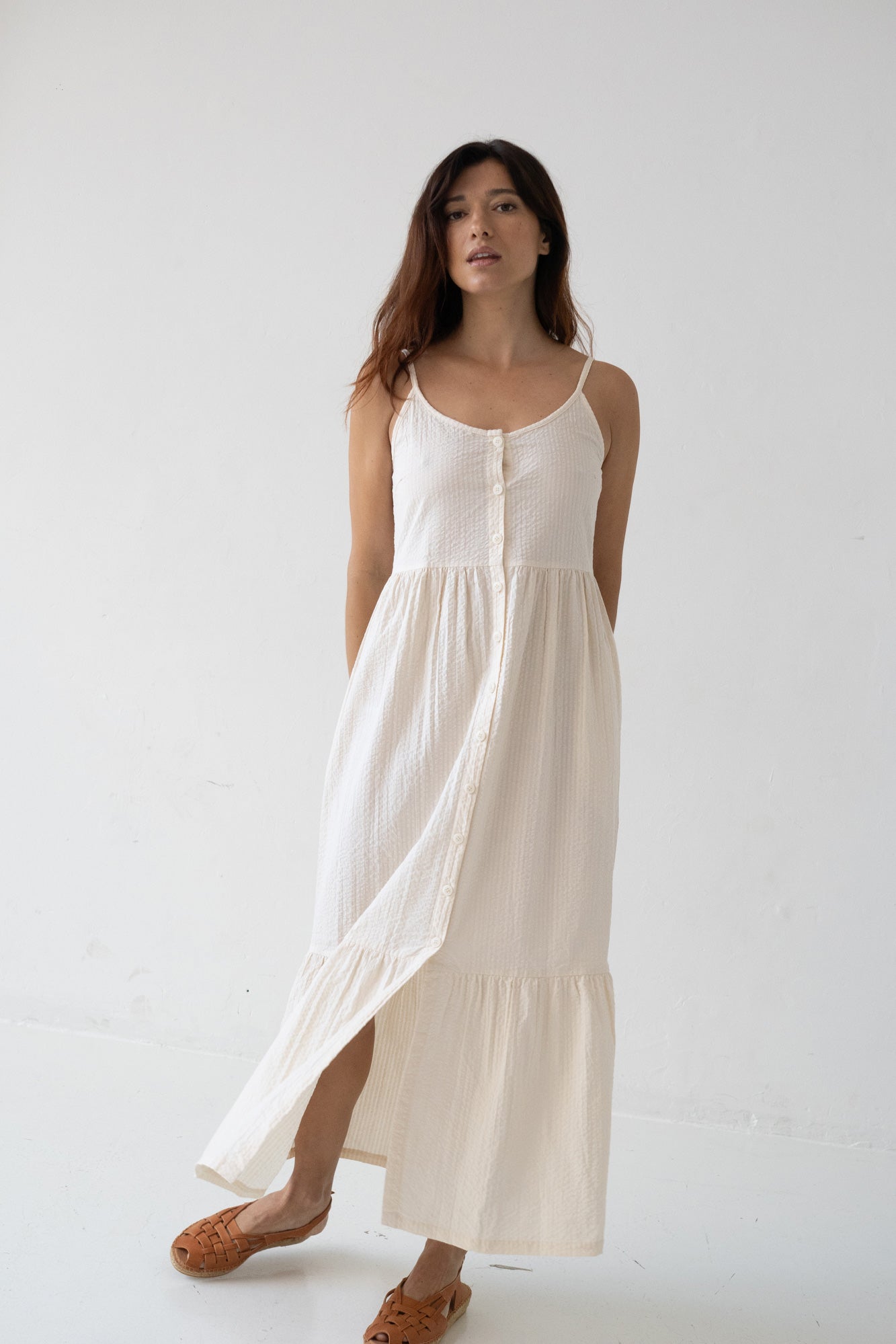 Our Belinda dress is a Summer must-have! It has the perfect length for beach walks or evening dates. A super comfy light dress crafted in our factory in Cataluña, Spain. It features side pockets and functional corozo buttons. White is associated with plenitude, purity and peace adding a lightness feeling.