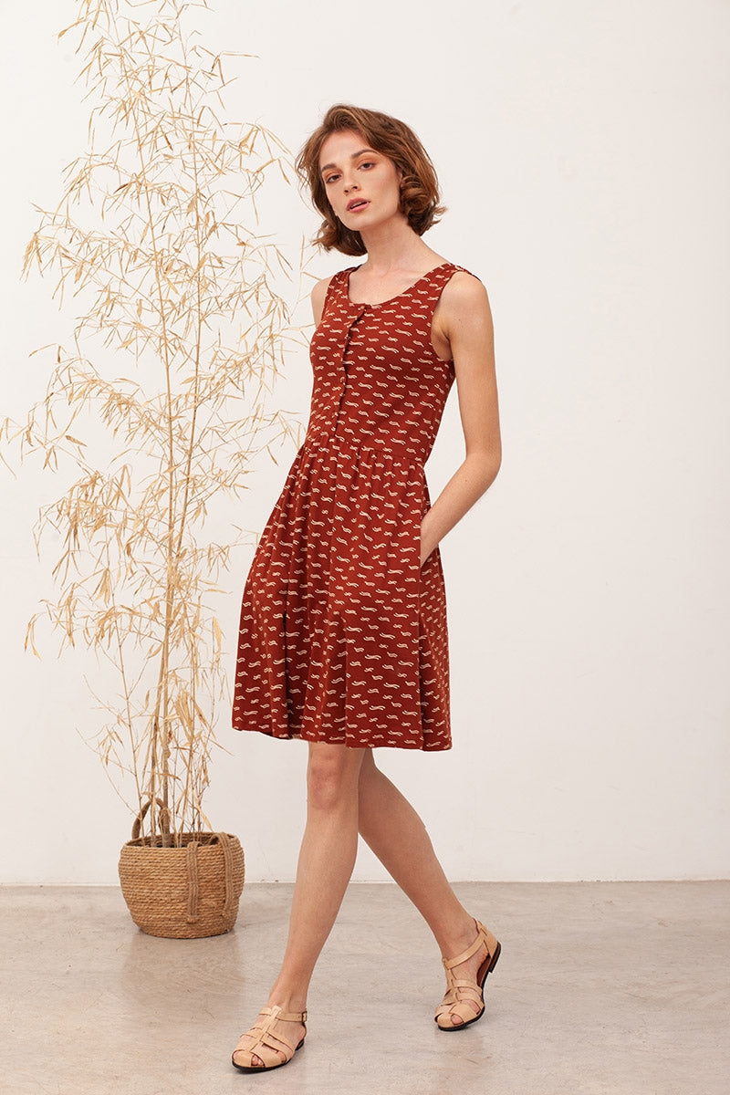 Belisa is a fitted waist knit dress with an elastic waistband. It has side pockets and functional buttons on the front. It has a beautiful back neckline with buttons. An ideal garment for the warmest days. Its terracotta waves print inspired on the positive footprint we want to leave on the Planet, gives this garment a special, unique and original touch.