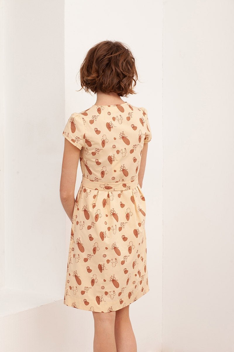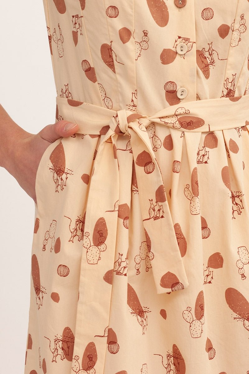 Belma is a waist-fitted dress with short sleeves. It has a v-neckline, functional buttons and an invisible zip on the side with a belt that you can adjust to your preference. It is made of ultra cool cotton poplin fabric, extra soft and pleasant to the touch. Its beige kangaroos print, inspired by the positive footprint we want to leave on the Planet, gives it a special, unique and original touch.