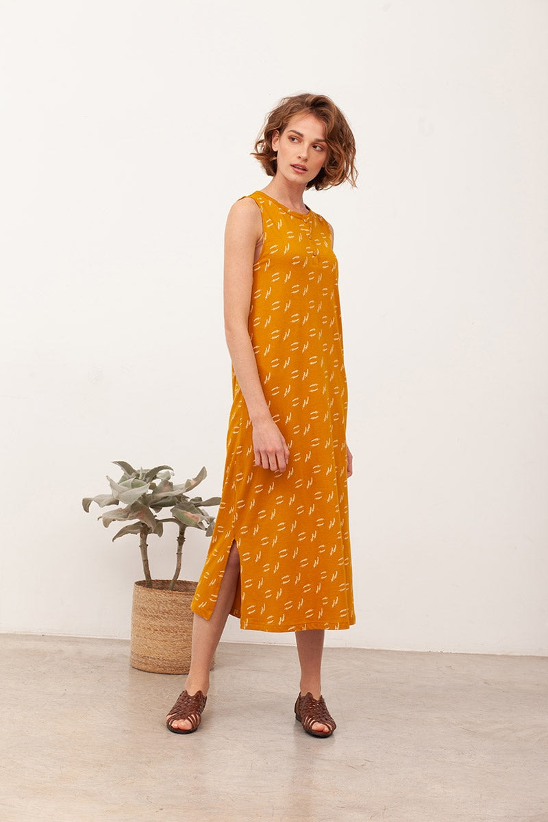 Berta is a maxi knitted dress with evasé cut. It has functional buttons at the neckline. An oversized and easy-wearing garment. Its mustard seaweed print inspired on the positive footprint we want to leave on the Planet, gives this dress an special, unic and original touch to this garment.