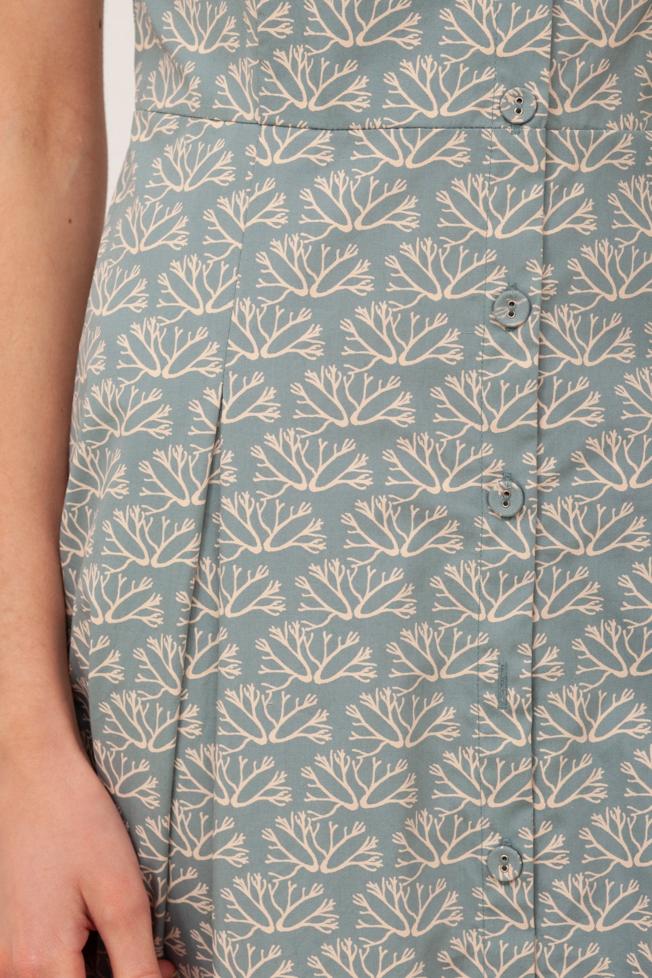 Betsy is a strappy dress tailored-fit at the waist. It has an invisible zip and functional buttons. A perfect midi length skirt with two gussets for a floaty look. A retro style garment, both comfortable and multifunctional. A casual and lightweight garment, perfect for the warmest days. It is made of ultra cool and soft poplin fabric, making it pleasant to the touch. Its blue coral print, inspired by the positive footprint we want to leave on the Planet, gives it a special, unique and original touch.