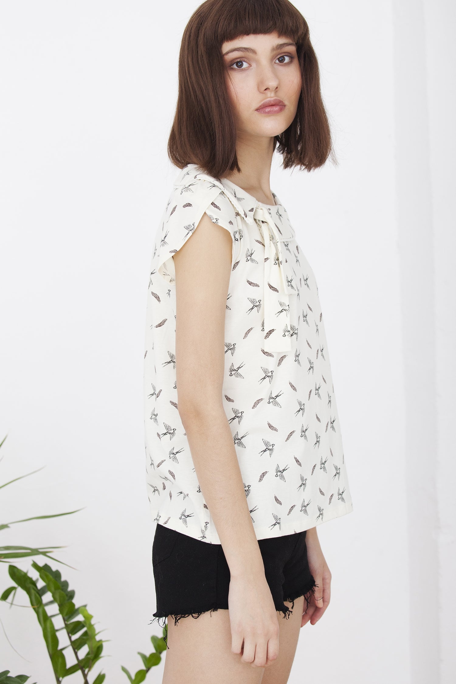 Ecru t-shirt with bird and feather print. Off- shoulder neck with a small lace. 100% Organic Fairtrade Certified Cotton.
