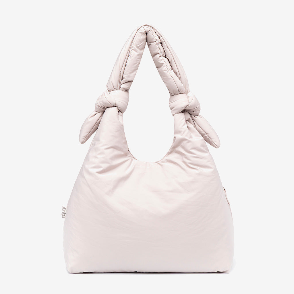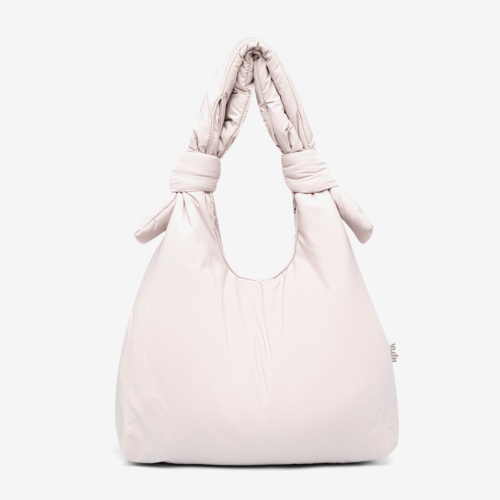 Quilted bag designed to be used both as a shoulder bag and as a messenger bag, thanks to its adjustable sliding knots. Its 100% recycled polyester fabric and soft quilting make it very light and pleasant to the touch. It has a large main compartment and a zipped pocket for small or essential items. Magnetic closure.