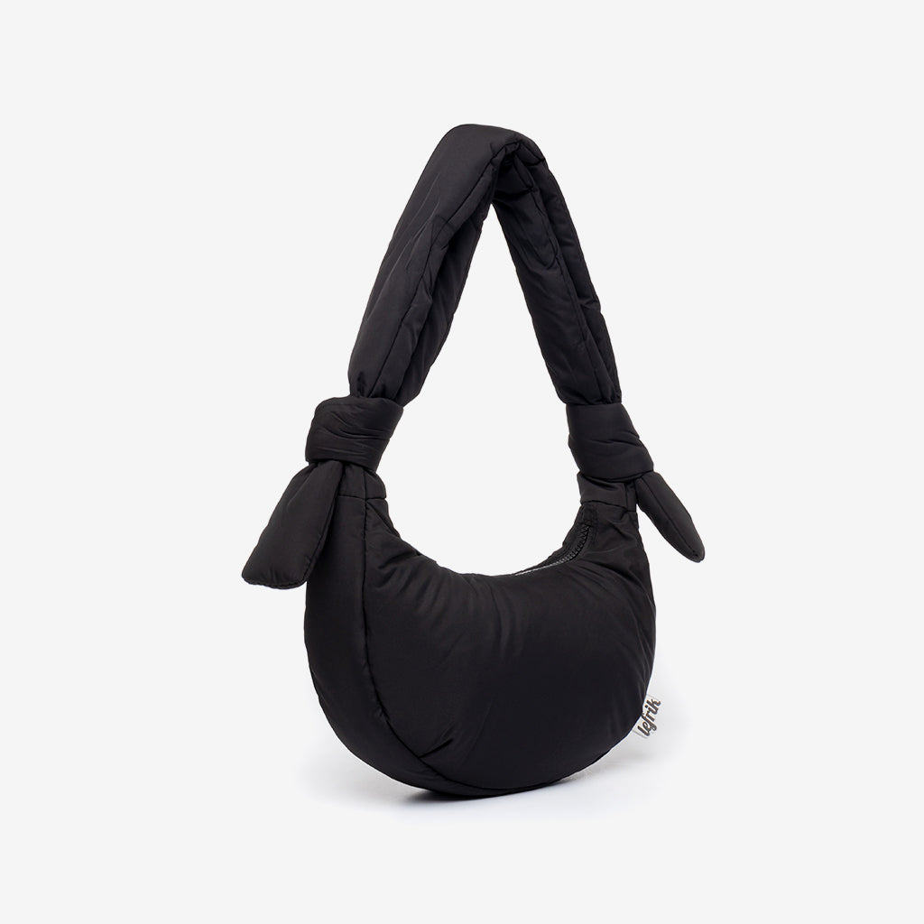 Puffy half moon bag with a minimalist and clean design. Features a large capacity main compartment with a zippered pocket. Designed to be used both as a shoulder bag and as a messenger bag, thanks to its adjustable sliding knots. Its 100% recycled fabric and soft quilting make it very light and pleasant to the touch.