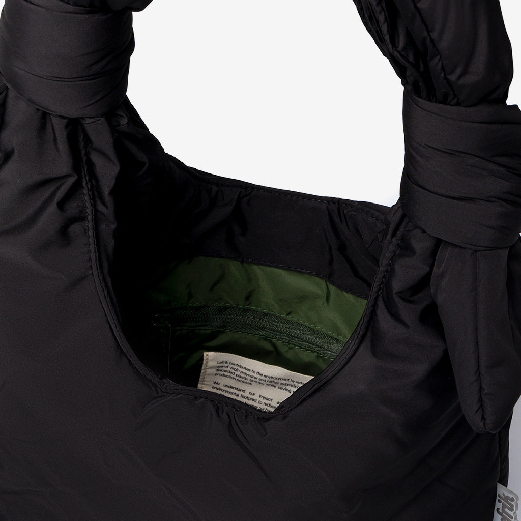 Mini version of our Biwa quilted bag. Designed to be used both as a shoulder bag and as a messenger bag, thanks to its adjustable sliding knots. Its 100% recycled fabric and soft quilting make it very light and pleasant to the touch.Large capacity main compartment and interior zipped pocket. Perfect for day or night.