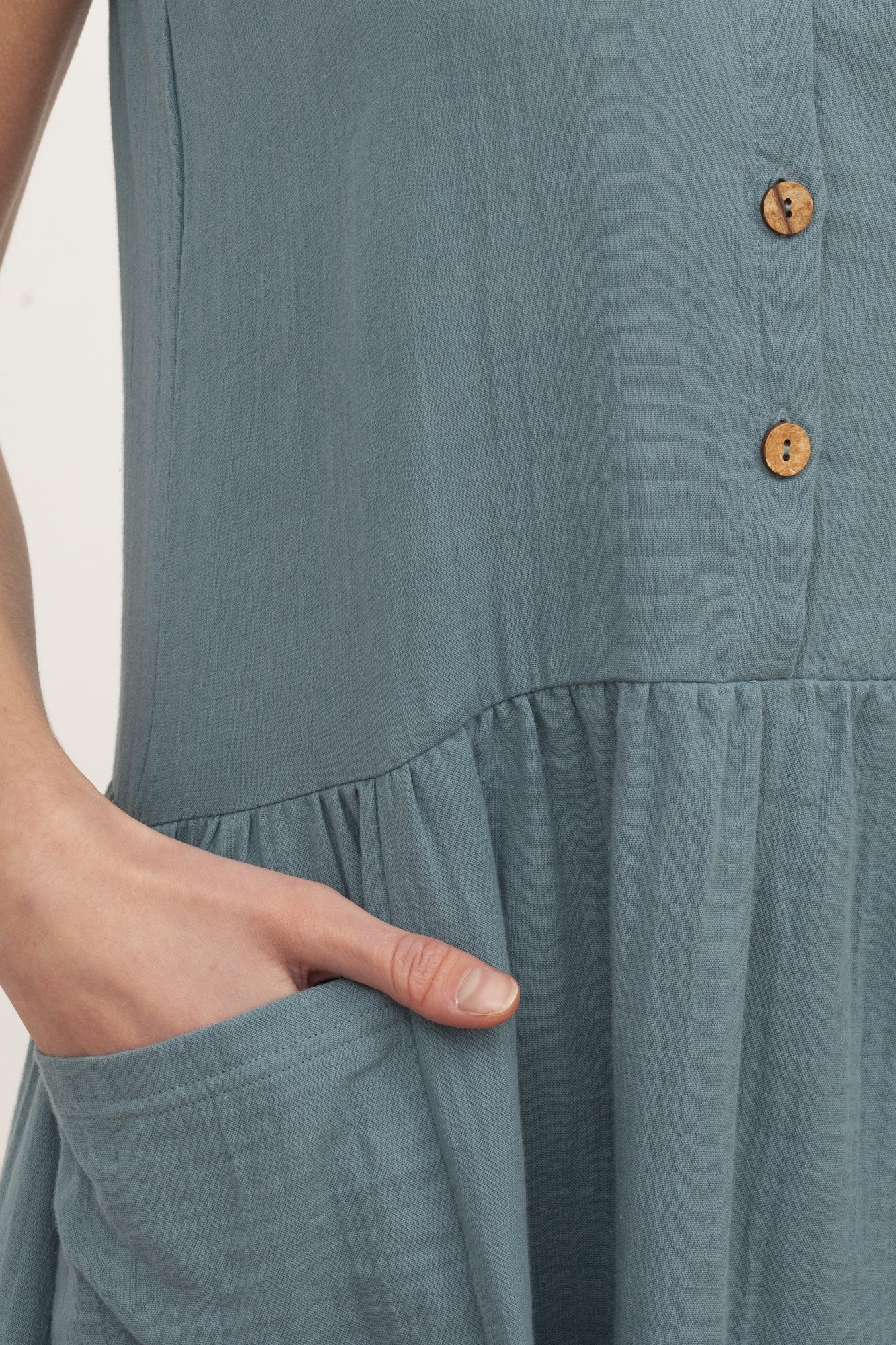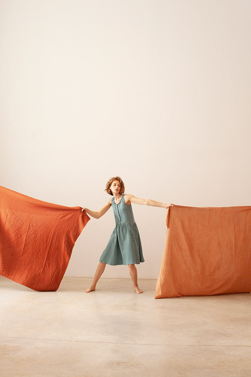Blossom is a loose-fitting, comfortable and very flattering dress, a garment you will fall in love with. It has functional coconut buttons and plaston pockets. You will be delighted by the blue colour of one of our «Basics Tiralahilacha» collection. Lightweight and very pleasant to the touch due to its soft muslin fabric, especially after the first wash. It has a perfect cut to wear during pregnancy and for breastfeeding. A smooth and timeless garment that will complement your sustainable wardrobe over many years.