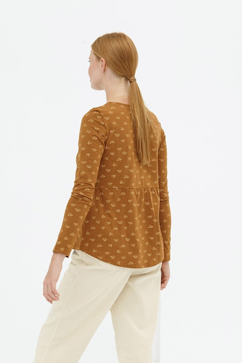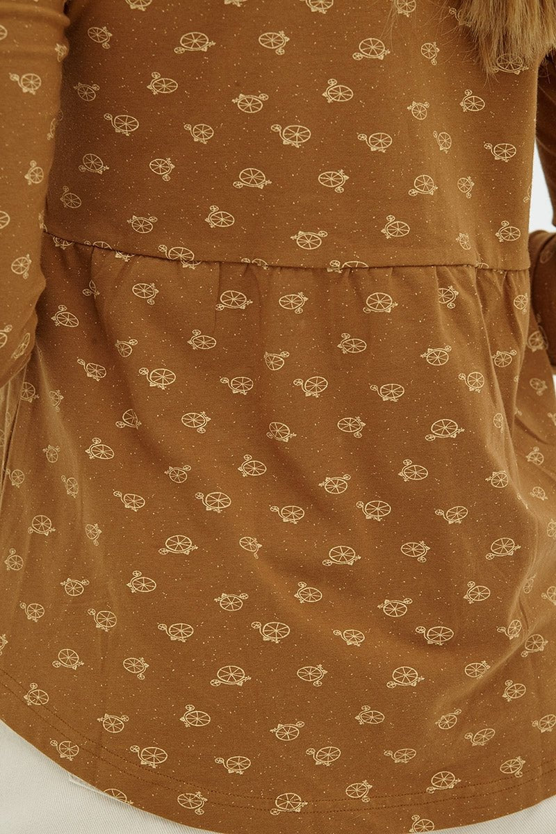 La blusa Delia con botones tiene un corte evasé y botones funcionales, también es reversible ;). Es cómoda y perfecta para combinar con unos jeans. El color marrón con estampado bicicletas inspirado en Circus, le da ese toque especial, único y exclusivo a la prenda.