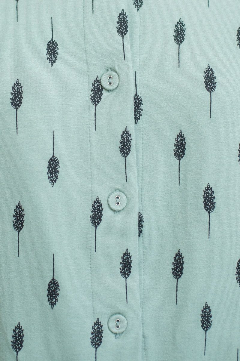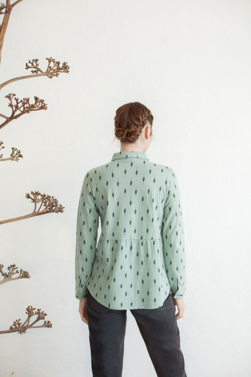 Blusa cuello camisero en verde agua con estampado hojas. Ropa de mujer ecológica confeccionada en algodón orgánico GOTS de comercio justo.
