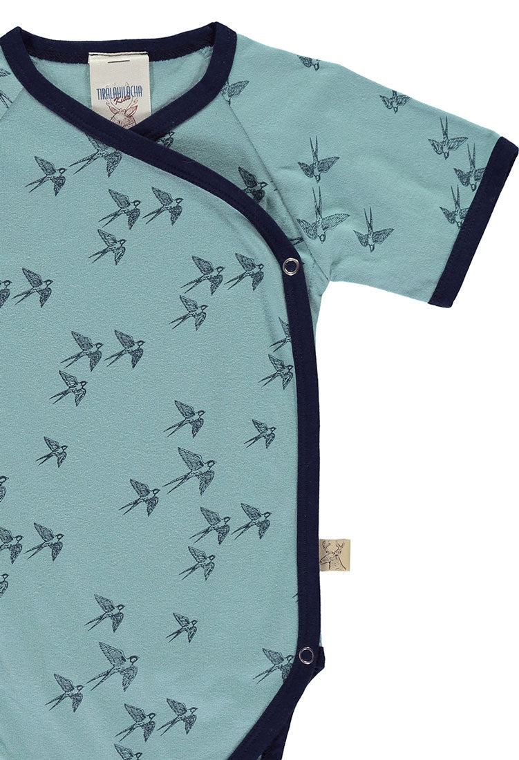 Body kimono azul con estampado golondrinas. 100% algodón orgánico de Comercio Justo Certificado.