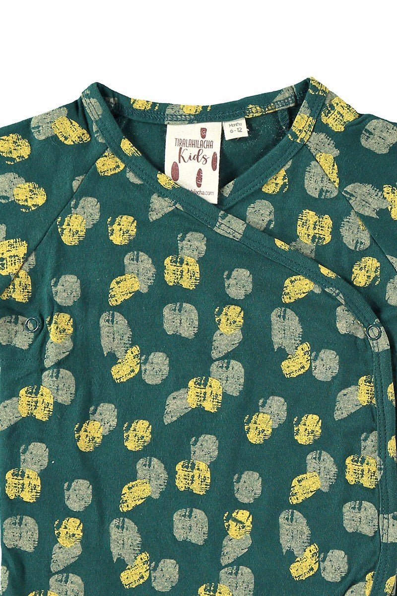 Short-sleeved knitted baby kimono with nickel-free clasps. Its blue-green footprints print from the Kudumbam collection, which means family in Tamil, inspired by the core values that move us at Tiralahilacha, gives the garment a unique and special touch. It feels very soft and pleasant on the skin. In addition, it is made free of toxins and is hypoallergenic.