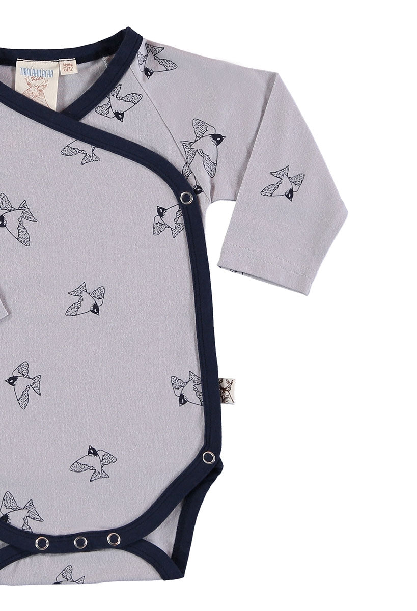 Body kimono gris con estampado de pájaros, combinado con azul marino. 100% algodón orgánico de Comercio Justo Certificado.