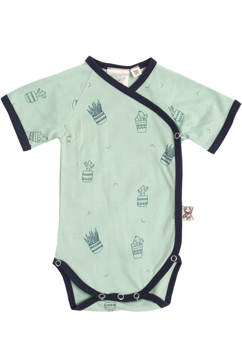 Body kimono verde con estampado de cactus en azul marino. 100% algodón orgánico de Comercio Justo Certificado.