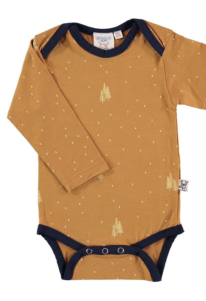 Body de manga larga mostaza con estampado de árboles combinado con azul marino. 100% algodón orgánico de Comercio Justo Certificado.