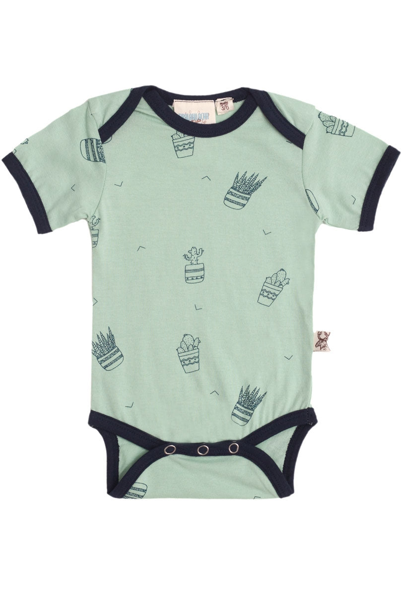 Body verde con estampado de cactus y contraste en azul marino. 100% algodón orgánico de Comercio Justo Certificado.