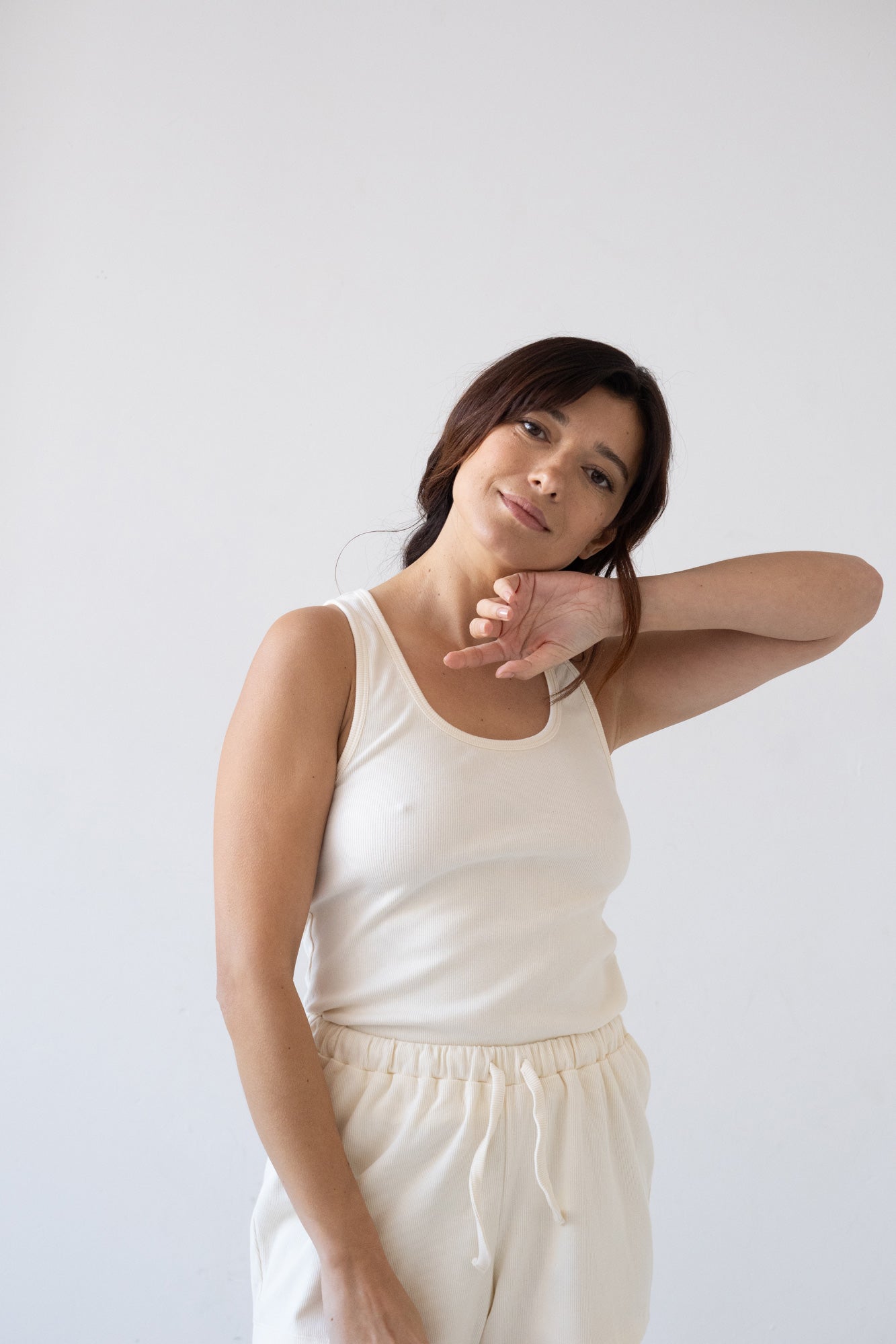 Bonnie is a super comfortable and soft tank top, an essential basic for your sustainable wardrobe! The ribbed fabric fits all kind of bodies and makes it a versatile basic with endless combinations. You can wear it as an undershirt, to practice any sport, or wear it underneath your cardigan. This garment has a very soft and pleasant touch on the skin. Also, it’s toxin-free and hypoallergenic. White is associated with plenitude, purity and peace adding a lightness feeling.