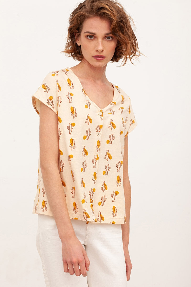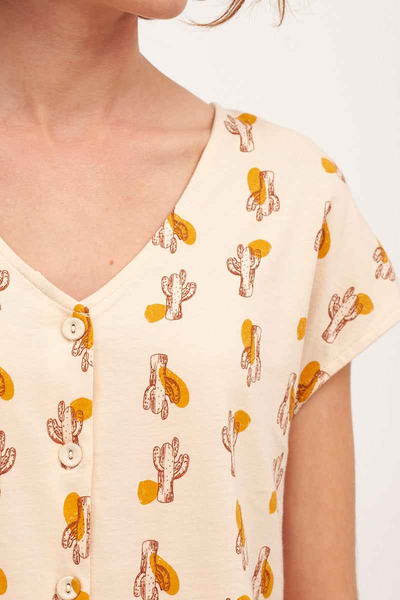 Brenda is a very comfortable and versatile knit blouse. It’s reversible! With functional buttons you can wear on the front or back of the garment. It is comfortable and perfect to combine with jeans or a nice skirt. Its beige cactus print inspired on the positive Footprint we want to leave on the Planet, gives it a very special, unique and original touch.
