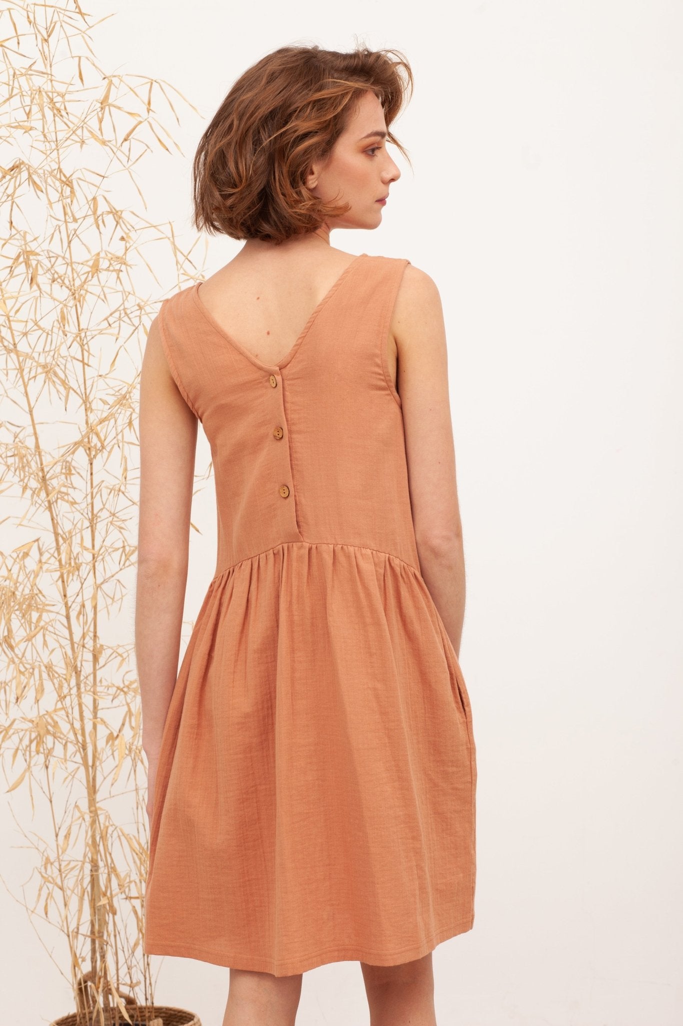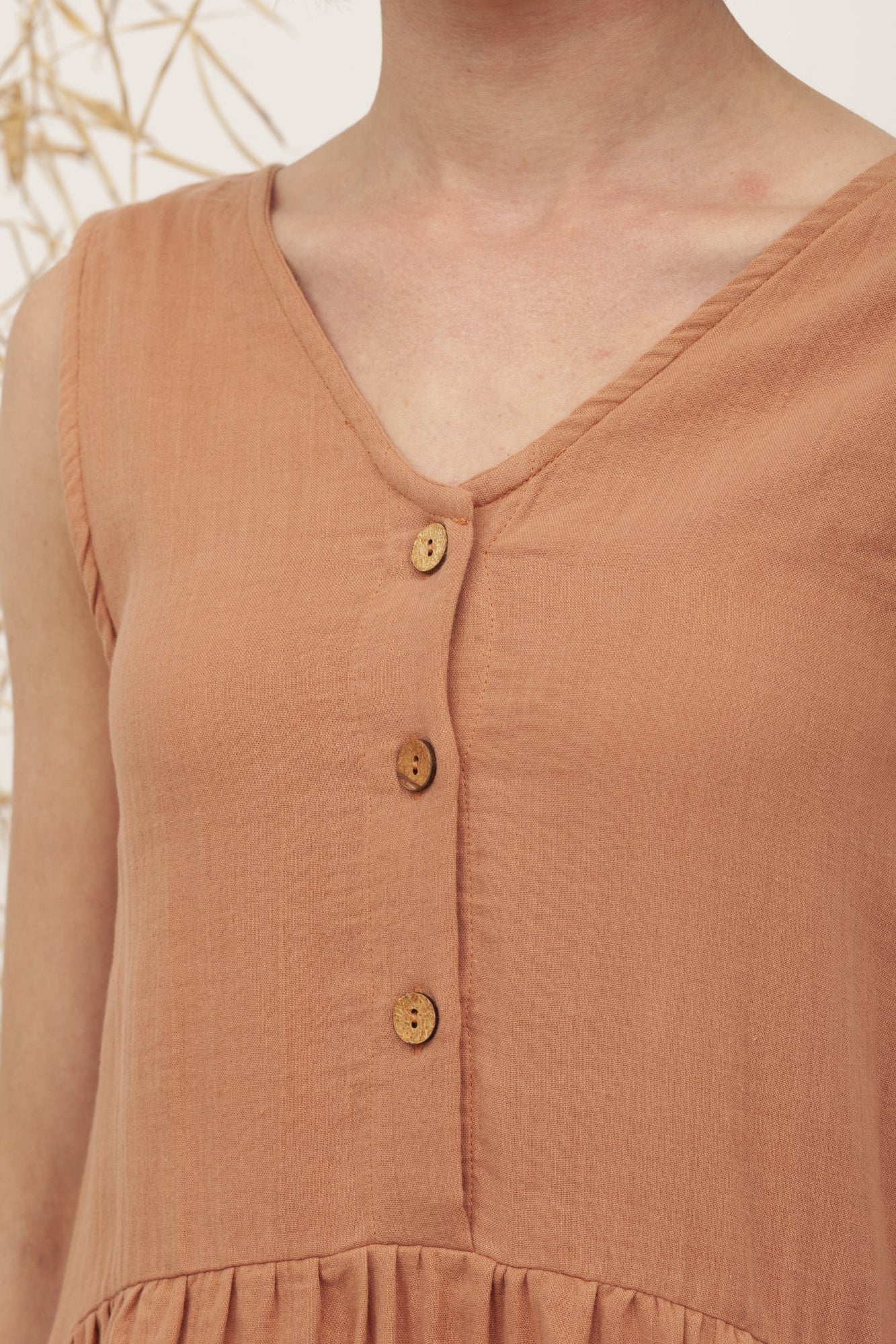 Brigitte’s reversible dress in nude is part of our «Basics Tiralahilacha» collection. It has straps, functional coconut buttons and side pockets, a very versatile garment that you can wear on the front or back. It is lightweight and very pleasant to the touch due to its extra soft muslin fabric, especially after the first wash. It has a perfect cut to wear during pregnancy and for breastfeeding. Plain-coloured and timeless garment to complement your sustainable wardrobe over the years.
