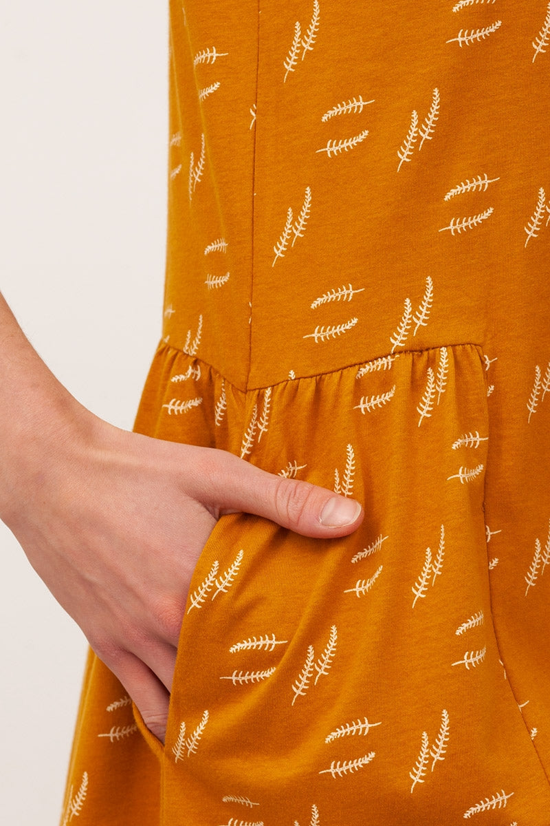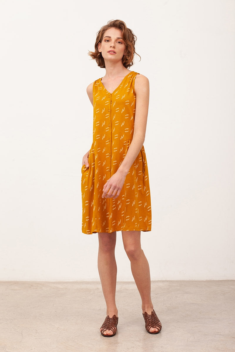 Brisa is a loose-fitting knit dress with an evasé cut. It has pockets and functional buttons, and the pleats on the sides give it an original touch. It is a very comfortable garment with the perfect cut to wear during pregnancy and for breastfeeding. Its mustard seaweed print inspired by the positive Footprint we want to leave on the Planet, gives the garment that special, giving it a unique and exclusive flair.