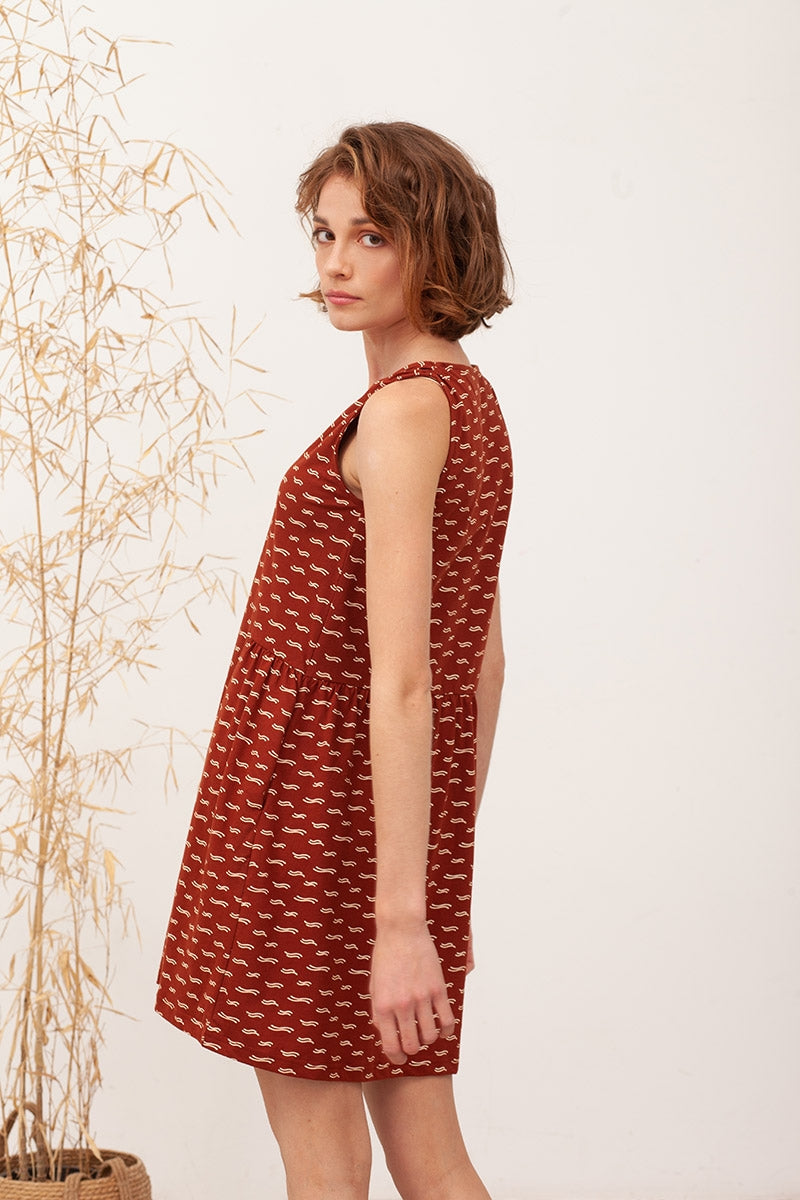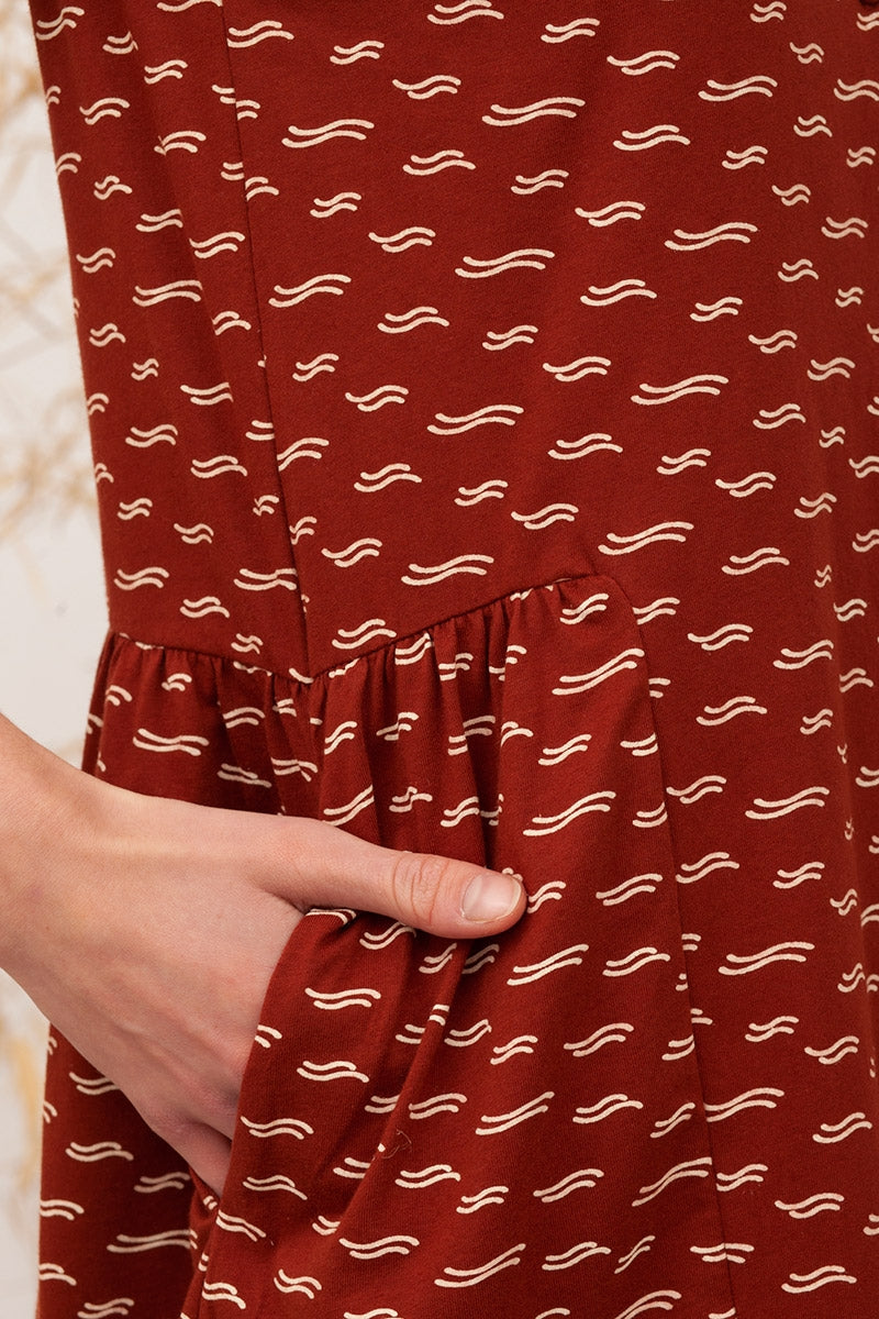 Brisa is a loose-fitting knit dress with an evasé cut. It has pockets and functional buttons, and the pleats on the sides give it an original touch. It is a very comfortable garment with the perfect cut to wear during pregnancy and for breastfeeding. Its terracotta waves print inspired by the positive Footprint we want to leave on the Planet, gives the garment that special, giving it a unique and exclusive flair.