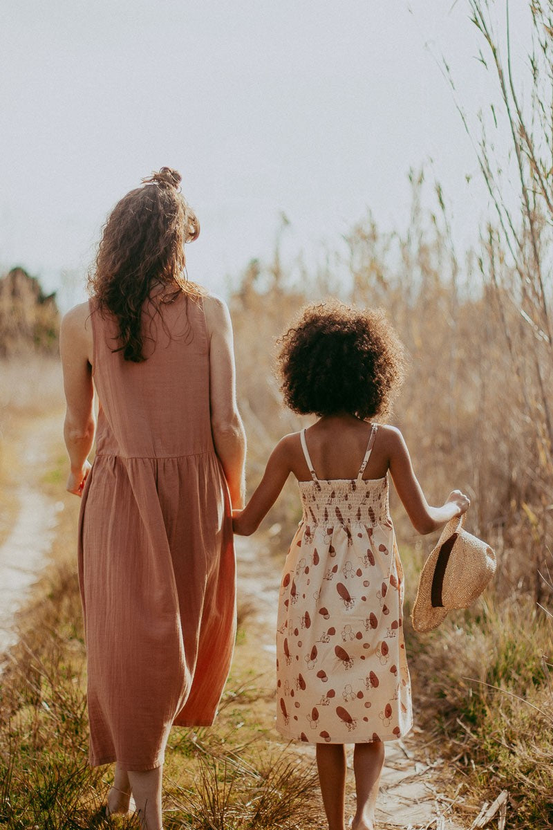 Brooke’s maxi dress in nude is part of our «Basics Tiralahilacha» collection. An elegant oversized dress with an empire cut. It has functional coconut buttons and side pockets. With a extra soft touch due to its muslin fabric, especially after the first wash. Perfect to wear during pregnancy and for breastfeeding. Timeless and falt garments to complement your sustainable wardrobe over the years.