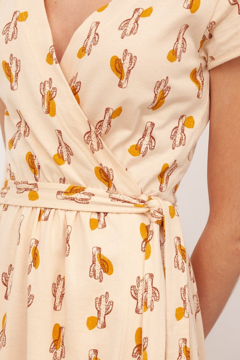 Bruna is an elegant and comfortable wrap dress. Short-sleeved with side pockets and a belt you can adapt to your preferences. A very versatile garment suitable to wear during pregnancy and for breastfeeding. Its beige cactus print inspired on the positive footprint we want to leave on the Planet, gives this garment a special and unique touch.