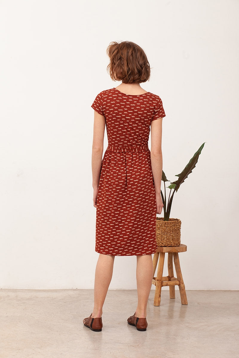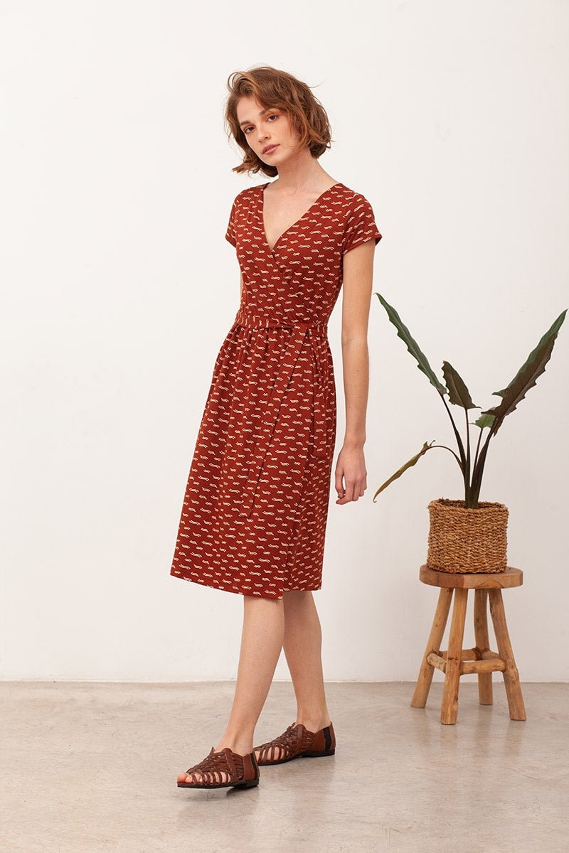 Bruna is an elegant and comfortable wrap dress. Short-sleeved with side pockets and a belt you can adapt to your preferences. A very versatile garment suitable to wear during pregnancy and for breastfeeding. Its terracotta waves print inspired on the positive footprint we want to leave on the Planet, gives this garment a special and unique touch.