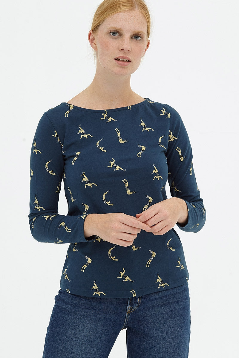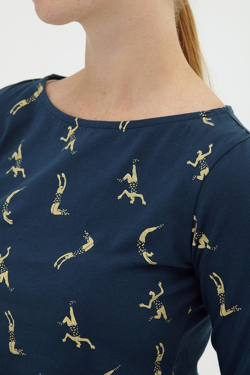 La camiseta básica con escote barco y manga ranglán es entallada y muy cómoda. Perfecta para combinar con jeans o una falda lisa. El color azul marino con estampado acróbatas inspirado en Circus, le da ese toque especial, único y exclusivo a la prenda.