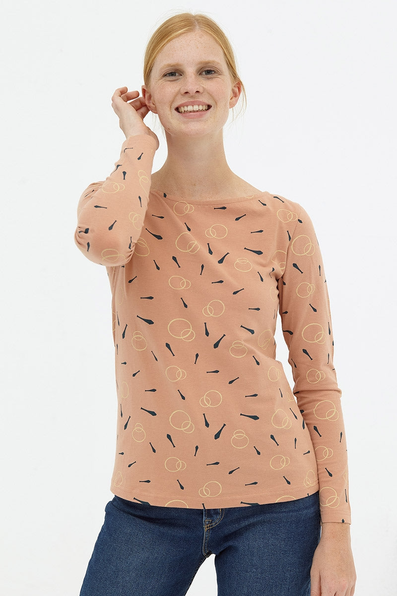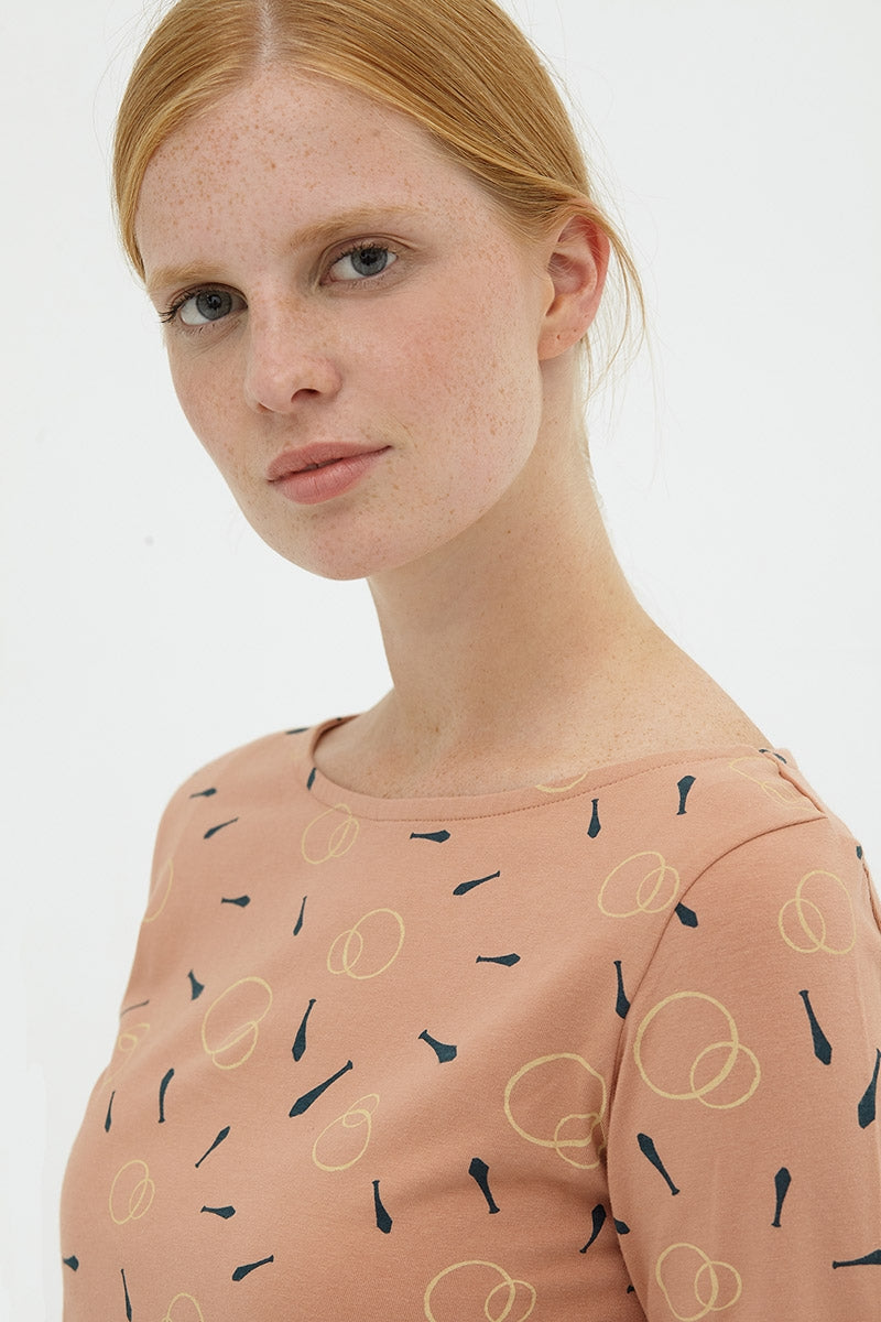 La camiseta básica con escote barco y manga ranglán es entallada y muy cómoda. Perfecta para combinar con jeans o una falda lisa. El color rosa pastel con estampado malabares inspirado en Circus, le da ese toque especial, único y exclusivo a la prenda.