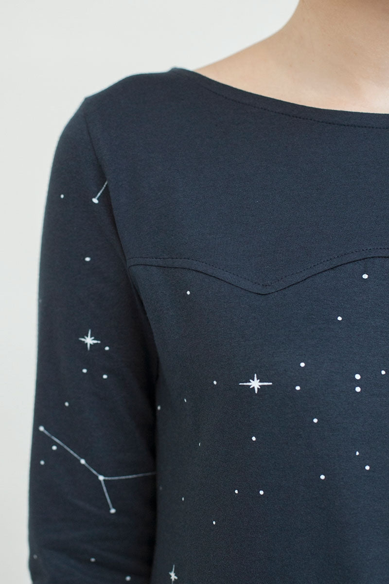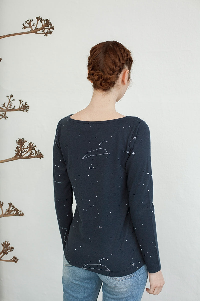 Camiseta con canesú en azul marino con estampado constelaciones. Ropa de mujer ecológica confeccionada en algodón orgánico GOTS de comercio justo.