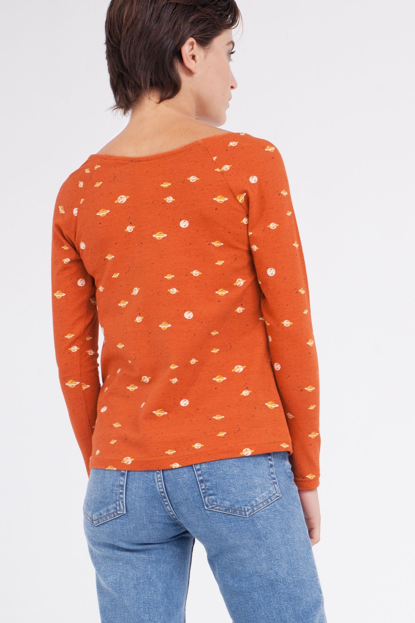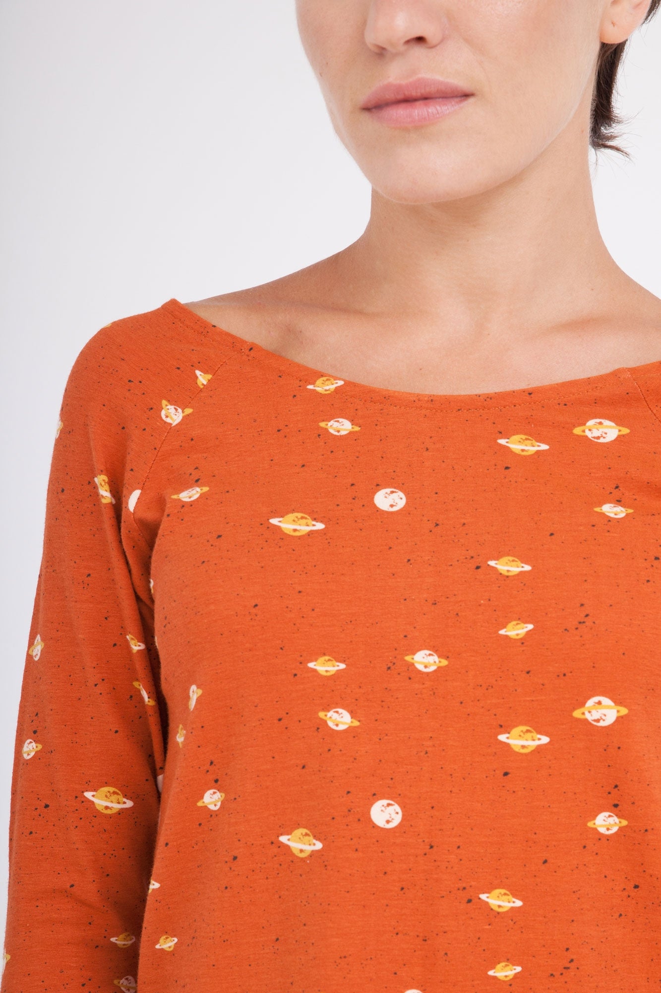 Claudia es una camiseta muy bonita y sensual. Tiene escote barco y manga ranglán. Al llevar el print de Saturno, hace que sea una pieza única y exclusiva. Ideal para llevar con unos jeans o falda. Ropa de mujer ecológica confeccionada en algodón orgánico GOTS de comercio justo.