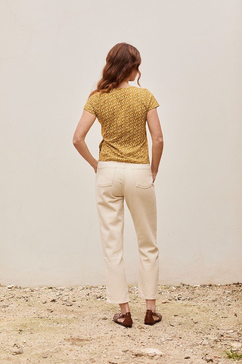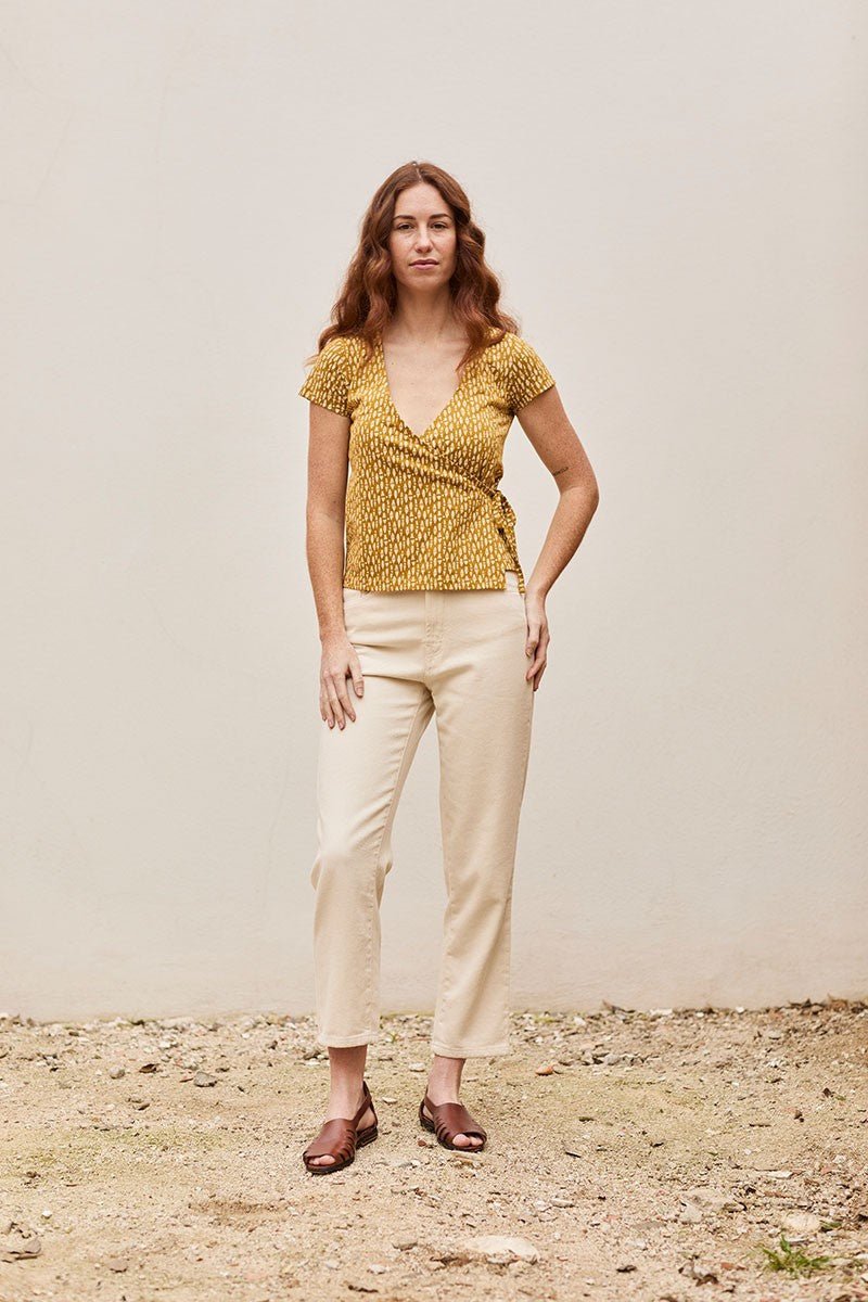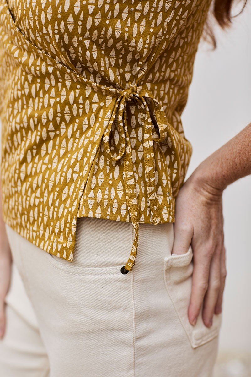 Faina es una camiseta con manga corta de punto de algodón orgánico cruzada con cierre de lazo en el lateral. Tiene también una lazada en el interior para que puedas ajustarla y entallarla más o menos según tus gustos. Queda genial con …… El estampado étnico color mostaza, de la colección Kudumbam, que significa familia en hindí, inspirado en el motivo fundamental que nos mueve en Tiralahilacha, le da ese toque único y especial a la prenda. Esta camiseta tiene un tacto muy suave y agradable en la piel. Además, está confeccionada libre de tóxicos y es hipoalergénica.