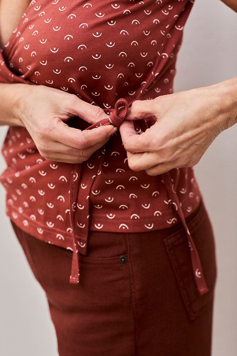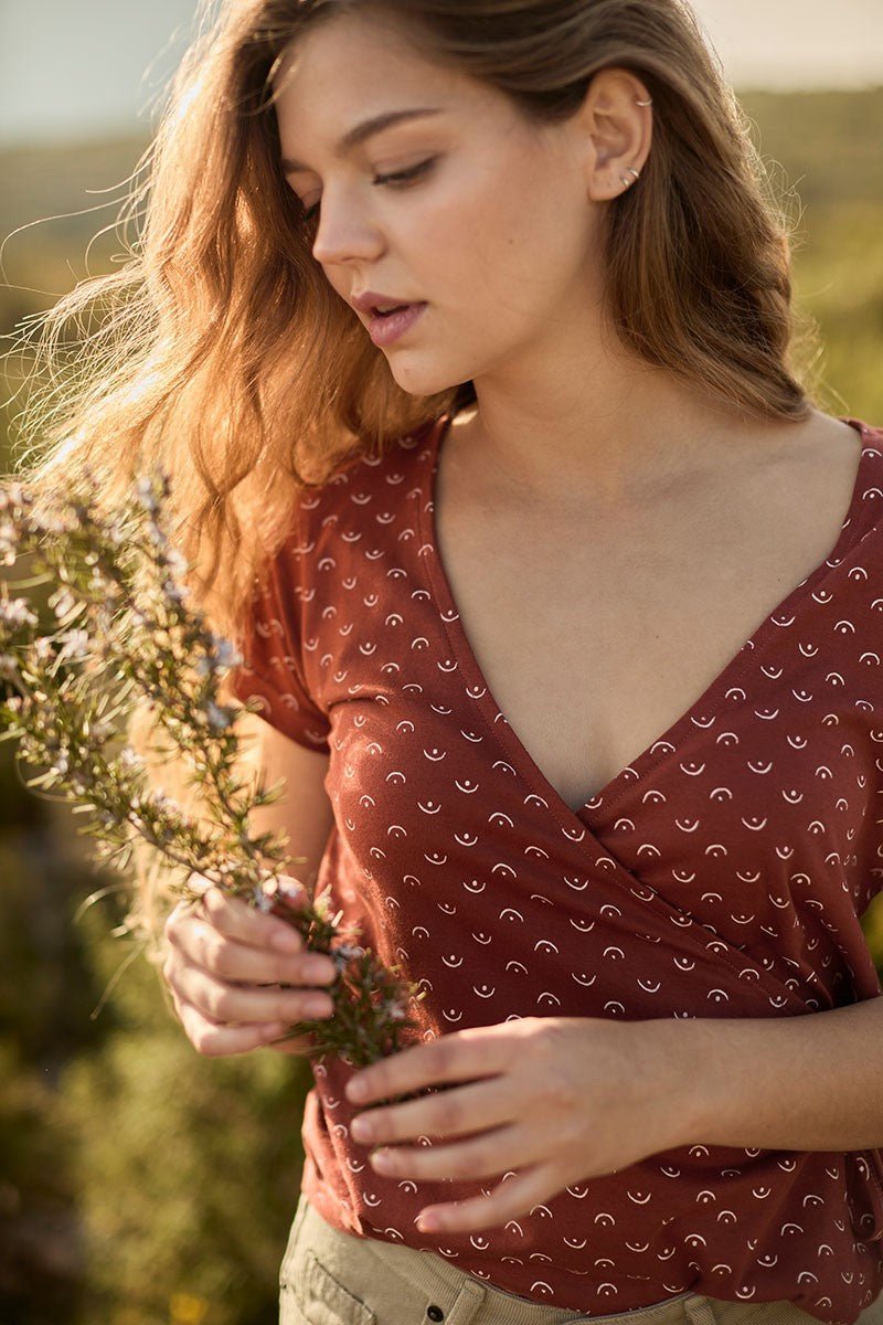 Faina es una camiseta con manga corta de punto de algodón orgánico cruzada. Tiene una lazada en el interior para que puedas ajustarla y entallarla más o menos según tus gustos. Queda genial con …… El estampado tetas color rojo de la colección Kudumbam, que significa familia en hindí, inspirado en el motivo fundamental que nos mueve en Tiralahilacha, le da ese toque único y especial a la prenda. Esta camiseta tiene un tacto muy suave y agradable en la piel. Además, está confeccionada libre de tóxicos y es hipoalergénica. SILUETA/FIT: Este modelo es de silueta semientallada. Sarah mide 1,81cm y lleva la talla S.