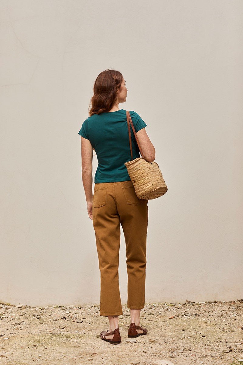 Faina es una camiseta con manga corta de punto de algodón orgánico cruzada. Tiene una lazada en el interior para que puedas ajustarla y entallarla más o menos según tus gustos. Un básico ORIGEN color verde azulado que queda genial con infinidad de prendas. Esta prenda tiene un tacto muy suave y agradable en la piel. Además, está confeccionada libre de tóxicos y es hipoalergénica.