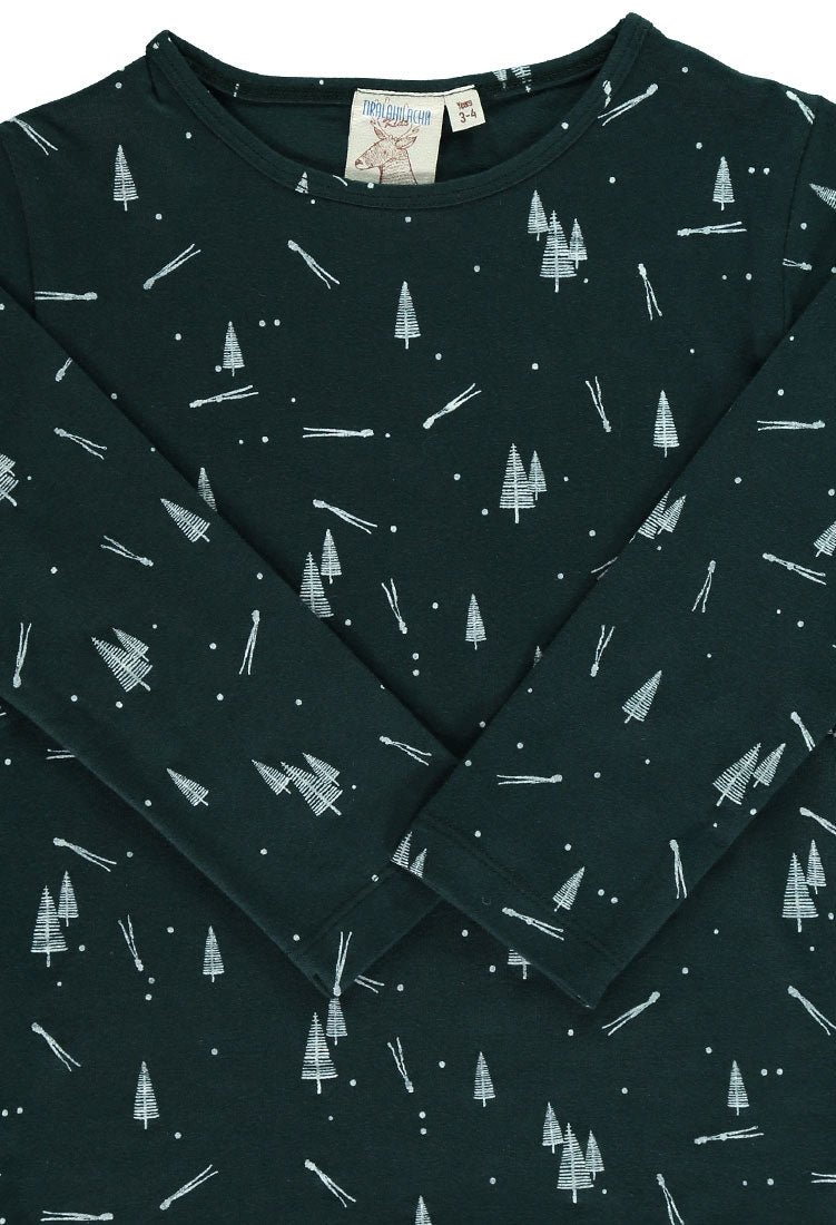 Camiseta de manga larga unisex color verde botella con estampado pinos. 5% Lycra 95% algodón orgánico de Comercio Justo Certificado.