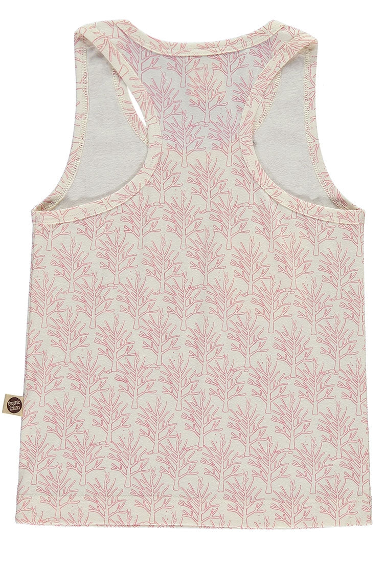 Camiseta sin mangas y detalle de bolsillo en color salmón con estampado de corales. 100% algodón orgánico de Comercio Justo Certificado.