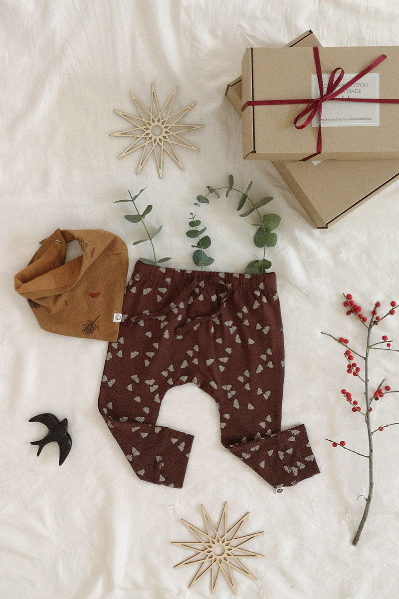 Baby pants. A garment to wear all year round. It fits perfectly to any baby’s body and has a ribbon at the waist for better fit and comfort. In brown with acorns print inspired by the most essential, our environment. HOME gives this garment an special touch. All our garments are hypoallergenic and chemical free to take care of your child’s sensitive and delicate skin.