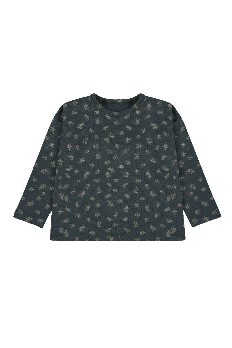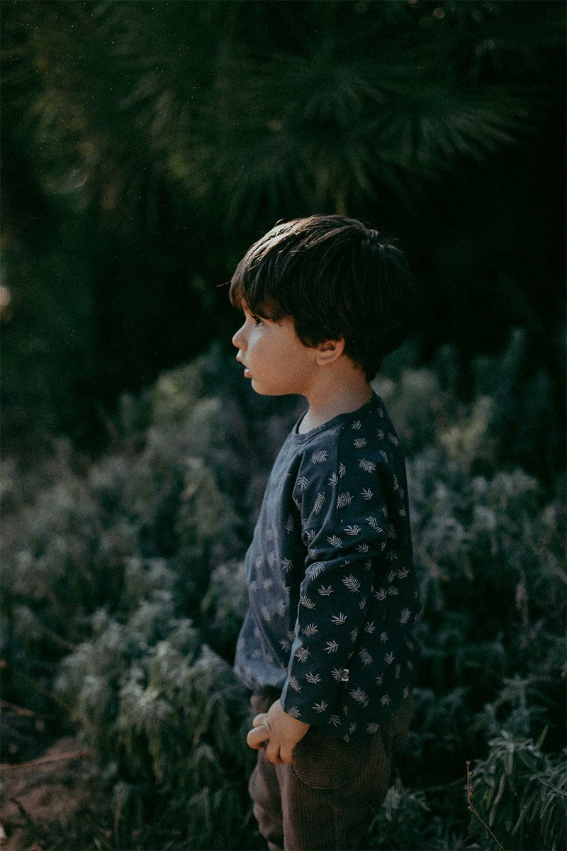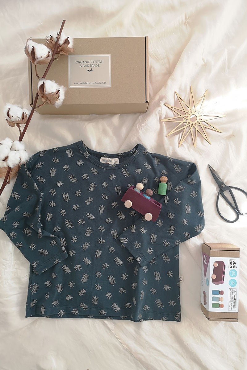 Unisex knitted T-shirt with dropped shoulders and long sleeves. This garment has a loose-fitting design allowing your little one to wear it for a longer period of time. In blue with fern leaves print inspired by the most essential, our environment, our home. HOME gives it this special touch. All our garments are hypoallergenic and chemical free to take care of your child’s sensitive and delicate skin.