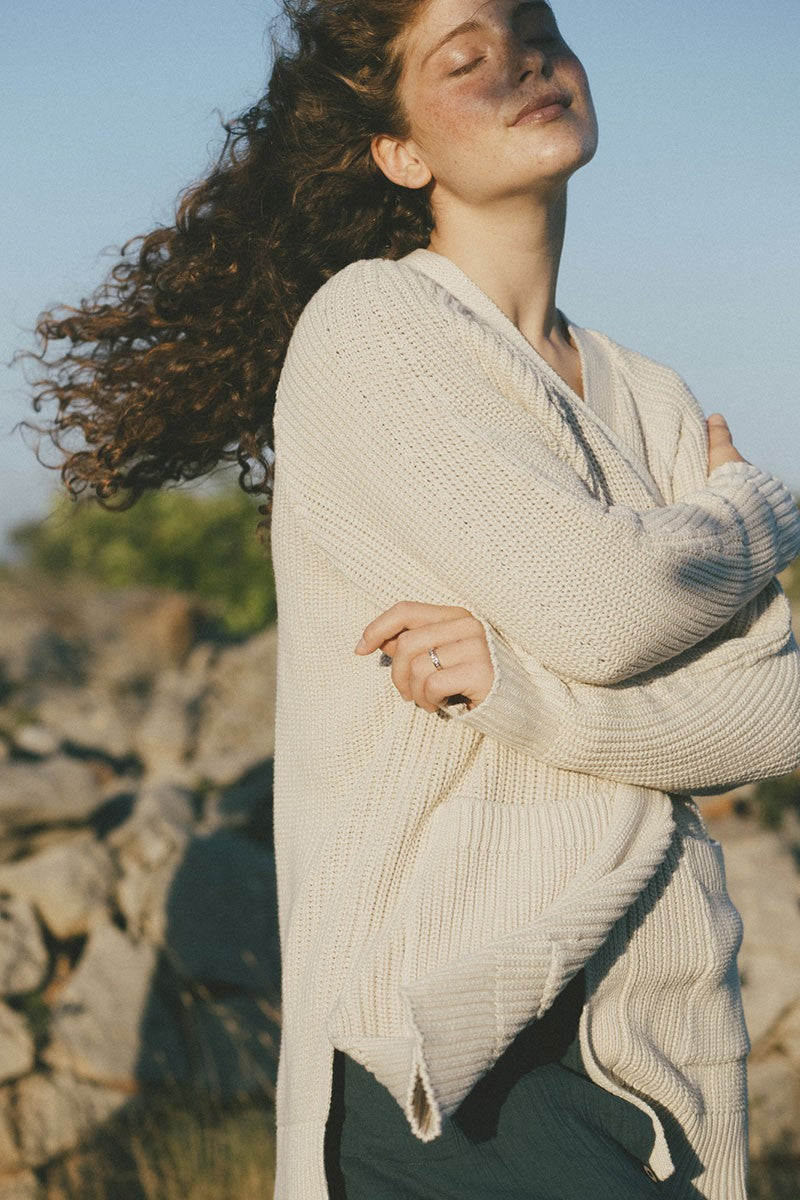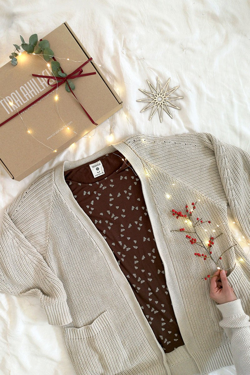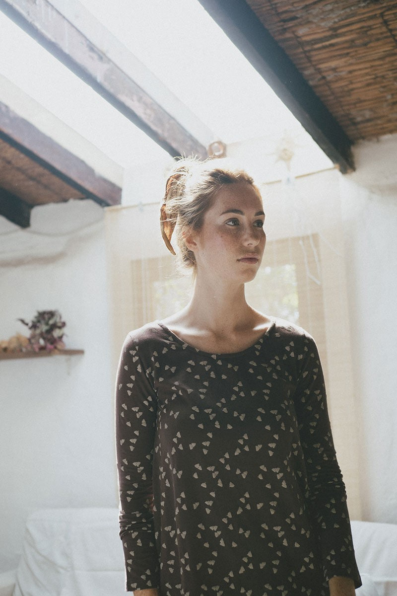 Suny is a knitted blouse with round neckline and evasé cut. The brown acorn print is inspired by the essential, our environment. Our home, HOME, gives that special touch to the garment. You can combine it with the Sibila trousers to wear your complete outfit.