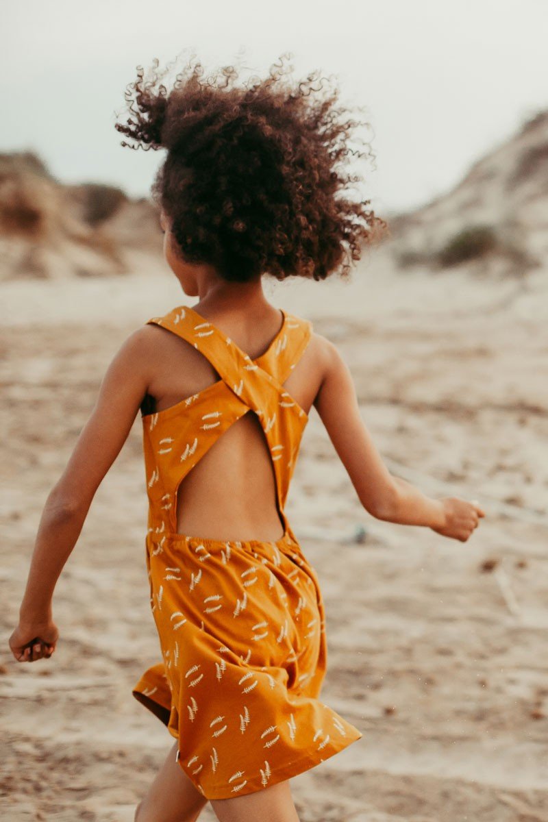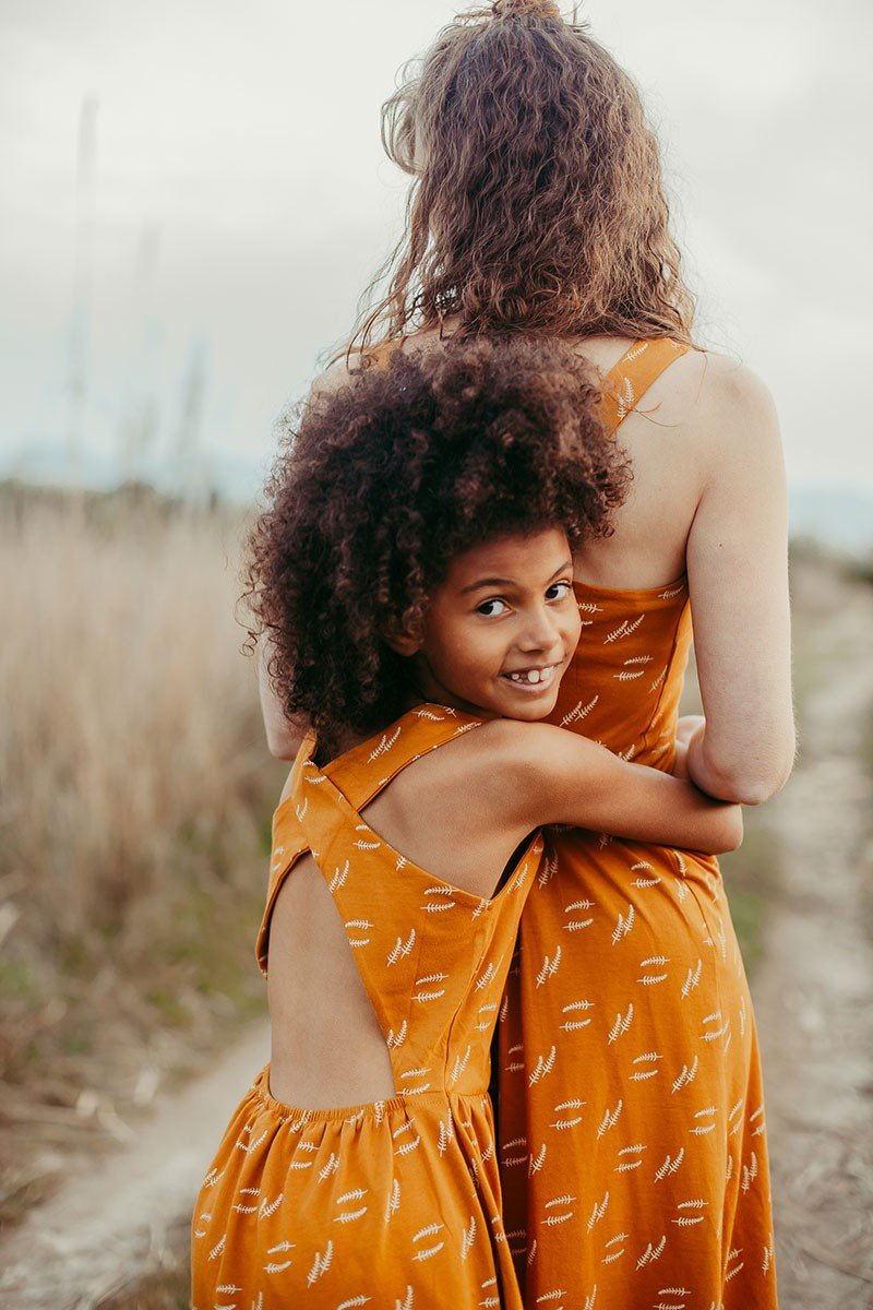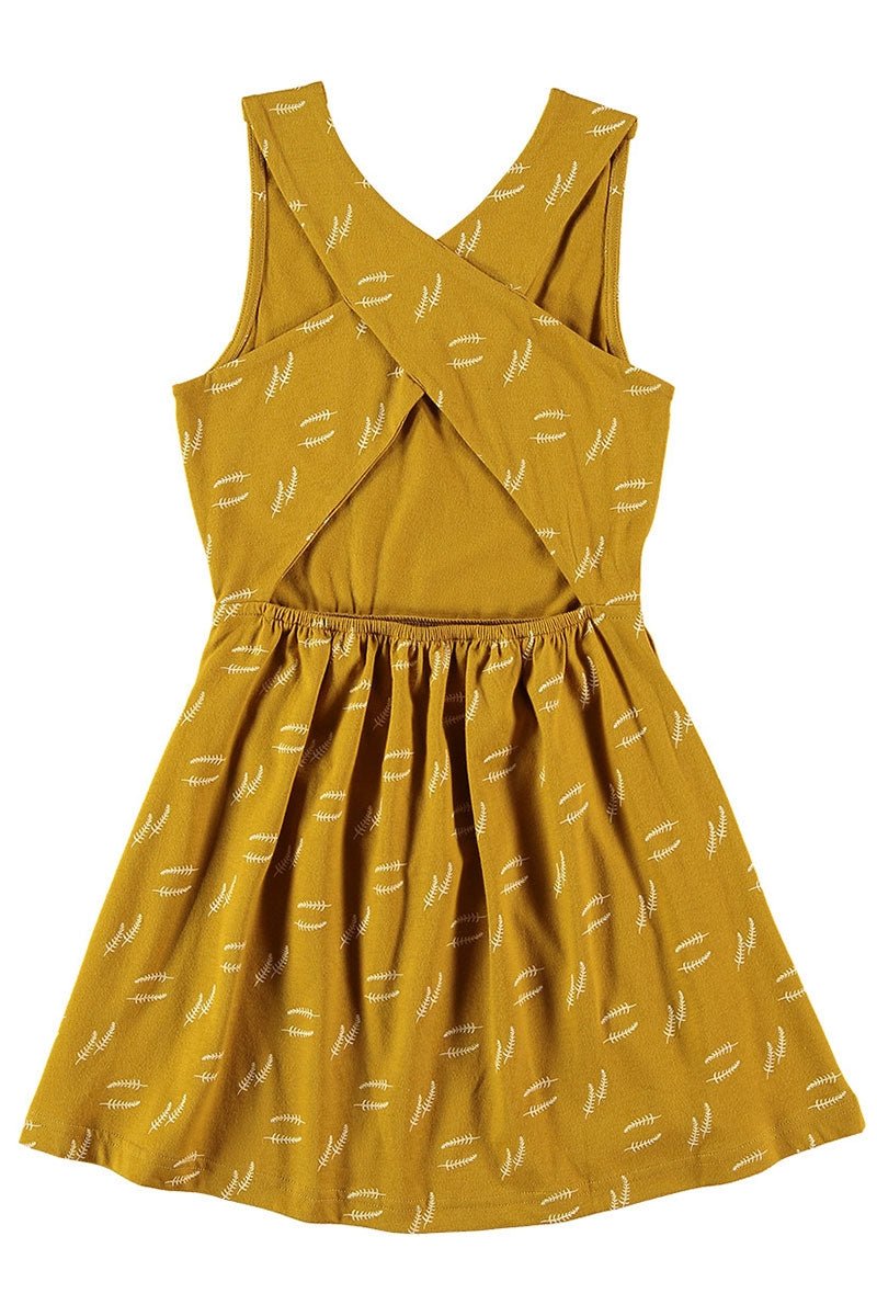 Cross back dress with cut at the waist, a «classic» in our collections. A loose and very comfortable garment. Its beautiful mustard seaweed print inspired by the positive footprint we want to leave on the Planet, makes this dress a special, unique and original garment.