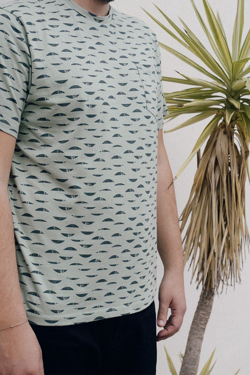 Eduard is a short sleeve knitted T-shirt for men. It is a loose-fitting model with chest pocket. The water reflections print in green of the Aqua collection, inspired by one of the essential life elements, gives that unique and special touch to the garment.