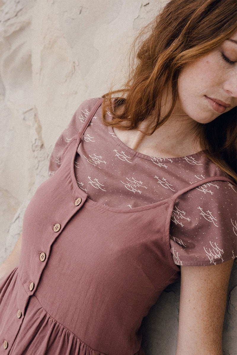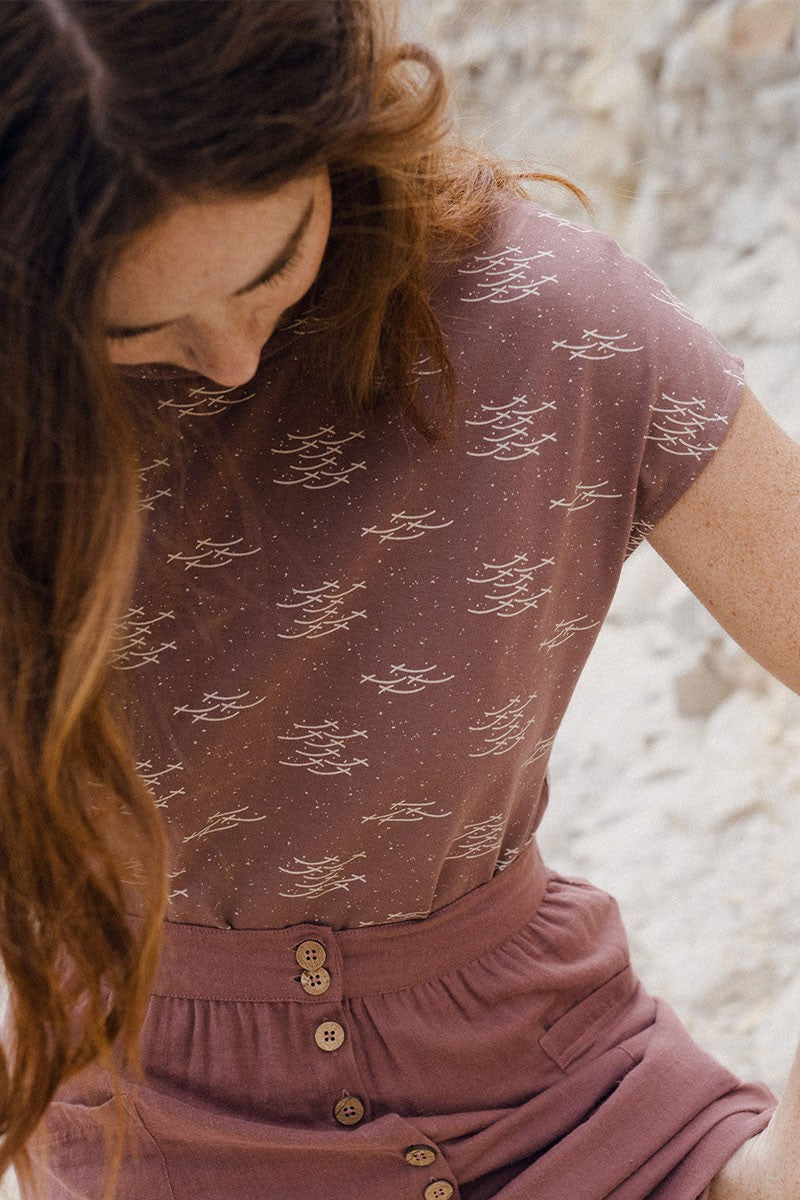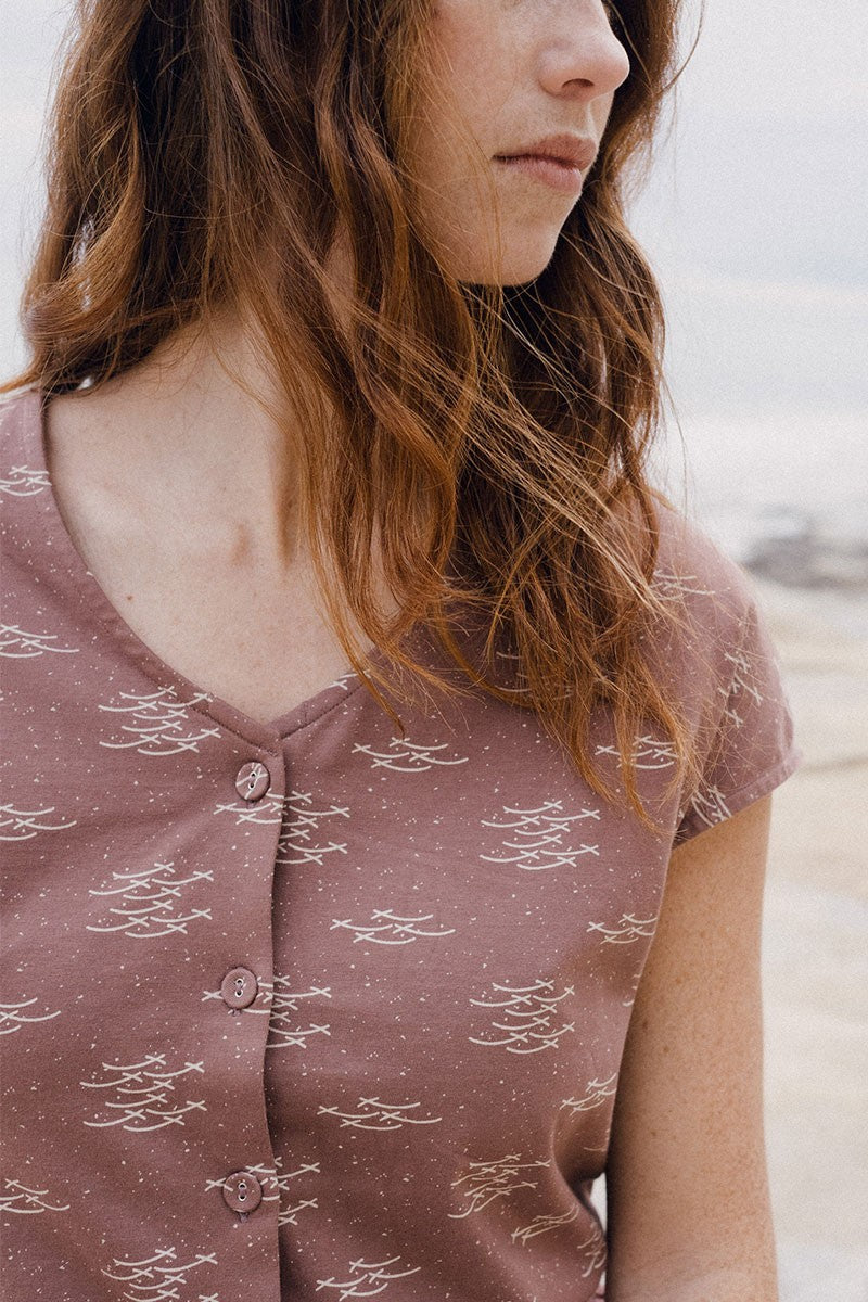 Elaine is a reversible short sleeve knitted T-shirt with a slit and beautiful functional buttons. It is very comfortable and has a loose silhouette. A versatile garment that you can combine with an infinite number of outfits. The fish school print in mauve from the Aqua collection, inspired by one of the essential elements for life, gives a unique and special touch to the garment.