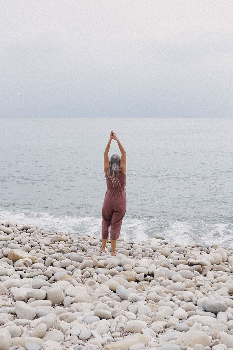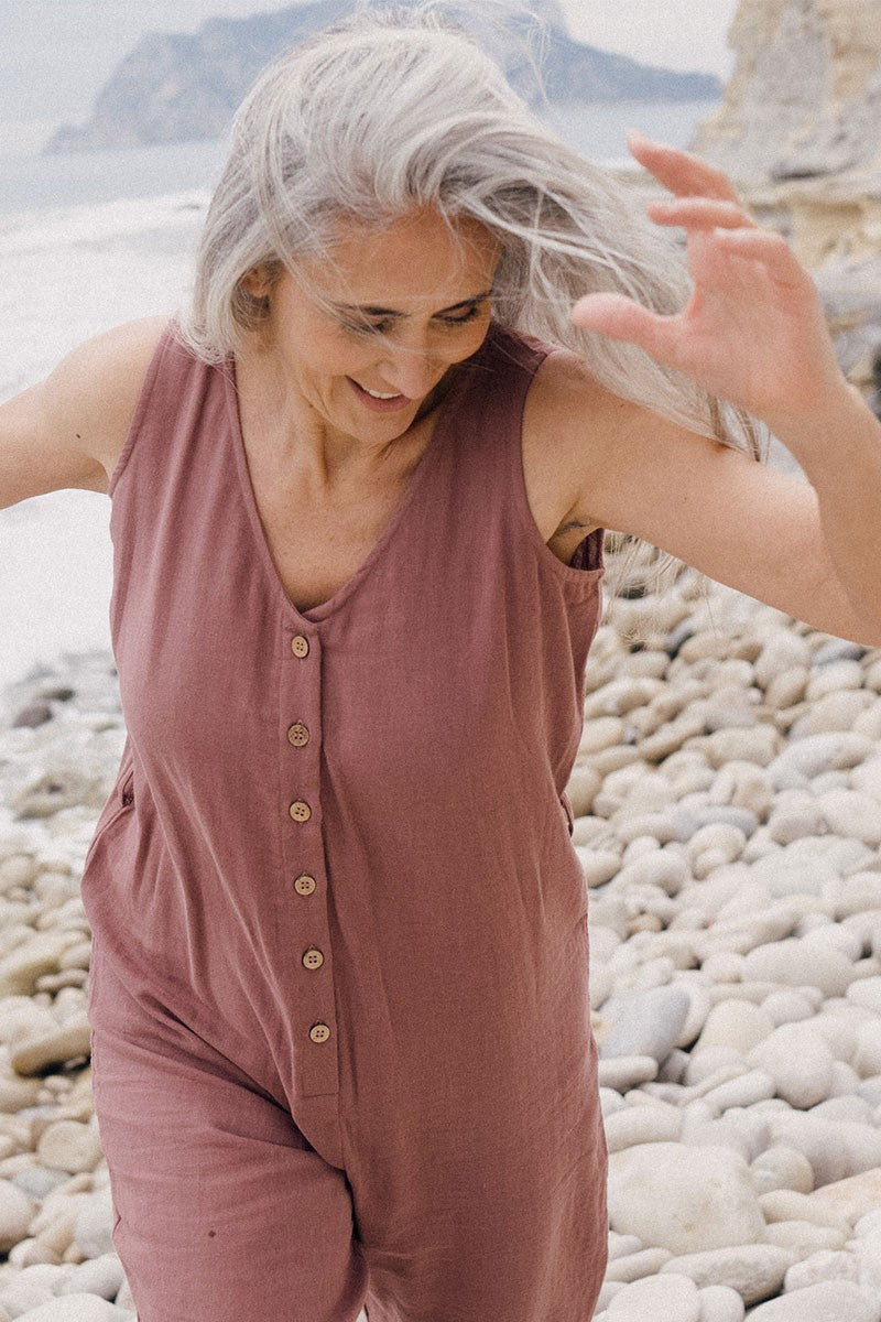 Elba is a loose-fitting knit jumpsuit with a slit and beautiful functional buttons. It has an optional belt to tie it to fit your waist. You can also remove the belt and wear it loose. It is an elegant and very versatile model allowing you to have two different styles in the same garment. A basic in mauve color that you can use from spring to autumn. It is made of muslin fabric, making it very soft and pleasant to the touch.