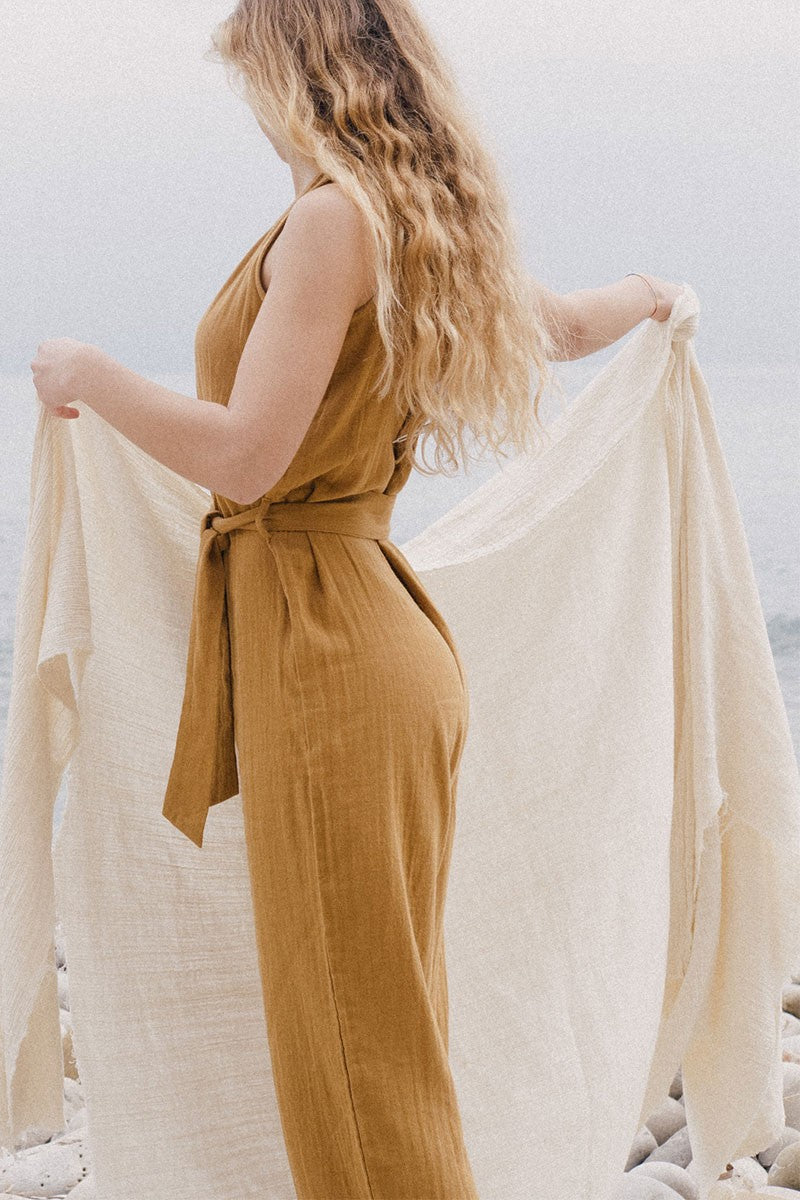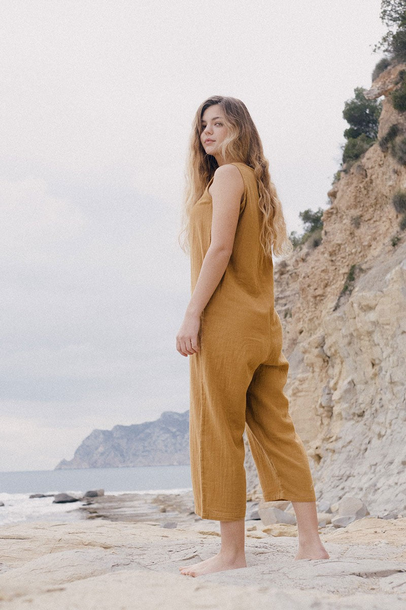 Elba is a loose-fitting knit jumpsuit with a slit and beautiful functional buttons. It has an optional belt to tie it to fit your waist. You can also remove the belt and wear it loose. It is an elegant and very versatile model allowing you to have two different styles in the same garment. A basic in mustard color that you can use from spring to autumn. It is made of muslin fabric, making it very soft and pleasant to the touch.