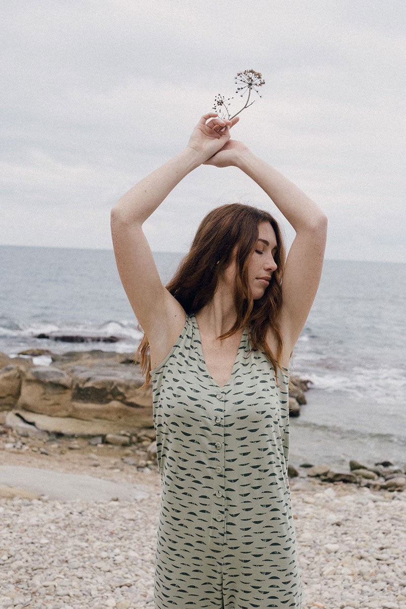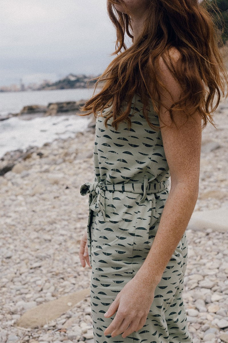 Elba is a loose-fitting knit jumpsuit with a slit and beautiful functional buttons. It has an optional belt to tie it to fit your waist. You can also remove the belt and wear it loose. It is a comfortable and very versatile model that allows you to have two different styles in the same garment. The emerald green water reflections print of the Aqua collection, inspired by one of the essential life elements, gives a unique and special touch to the garment.
