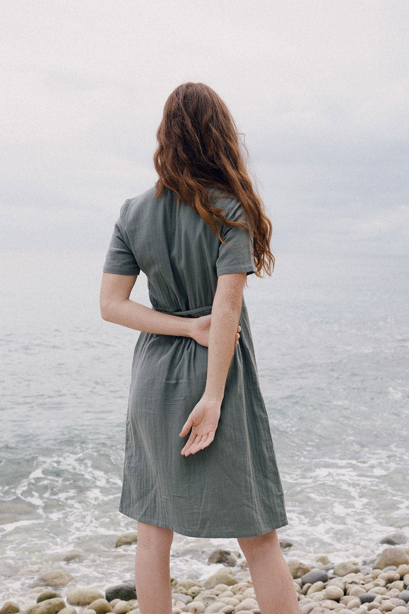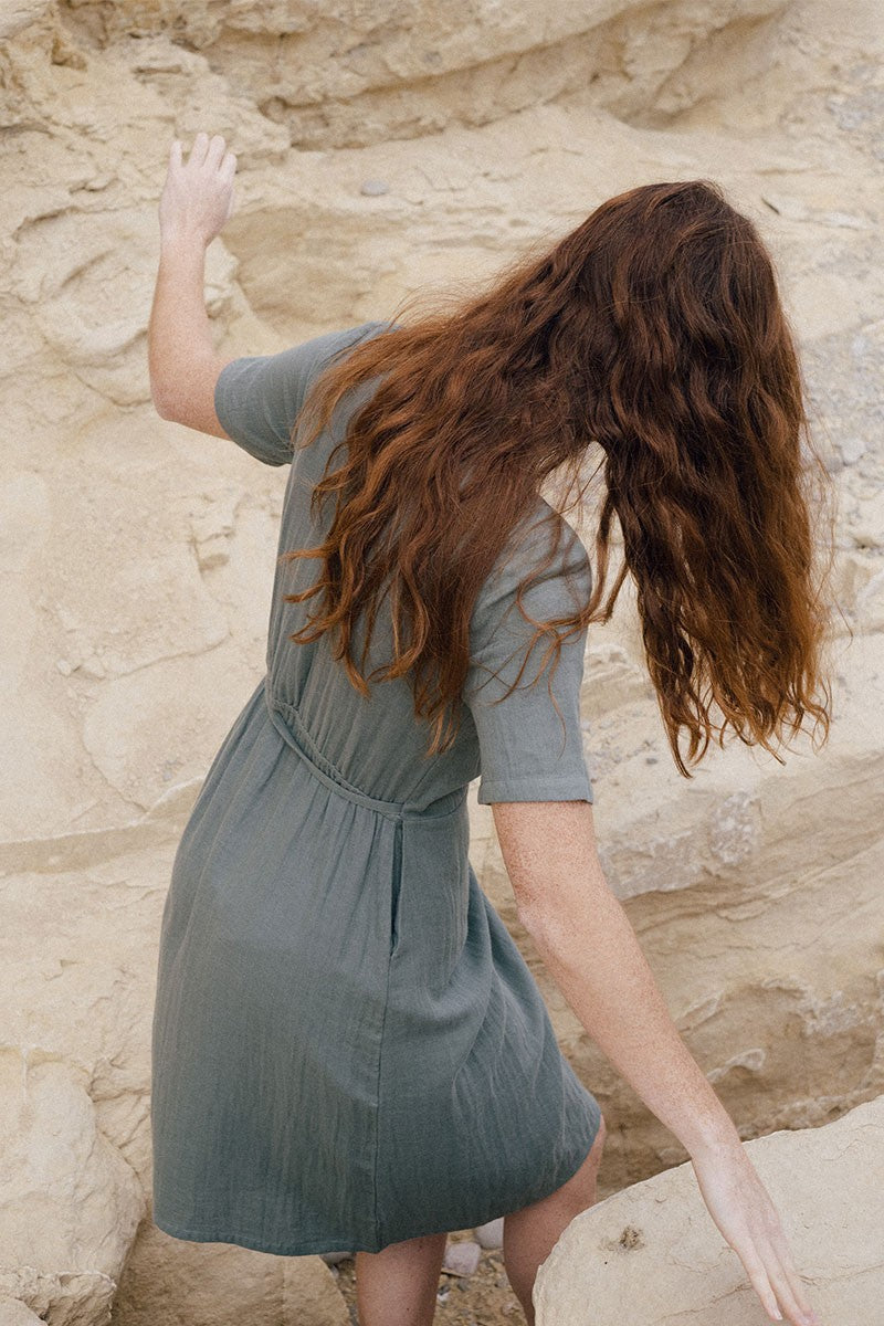 Eliette is a short-sleeved muslin crossover dress. It has a lacing that allows to adjust to your waist. A very soft and elegant model that stylizes the silhouette. Versatile and timeless garment in emerald green. It is made of muslin fabric, making it very smooth and nice to the touch.