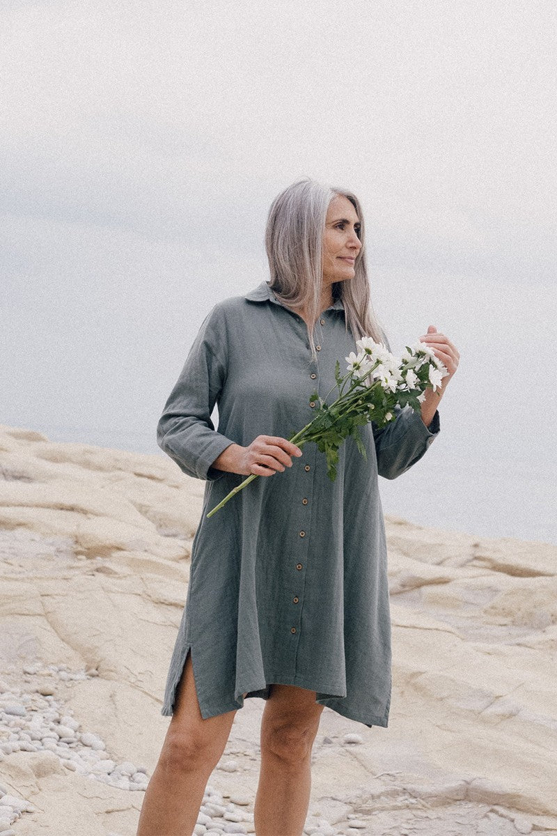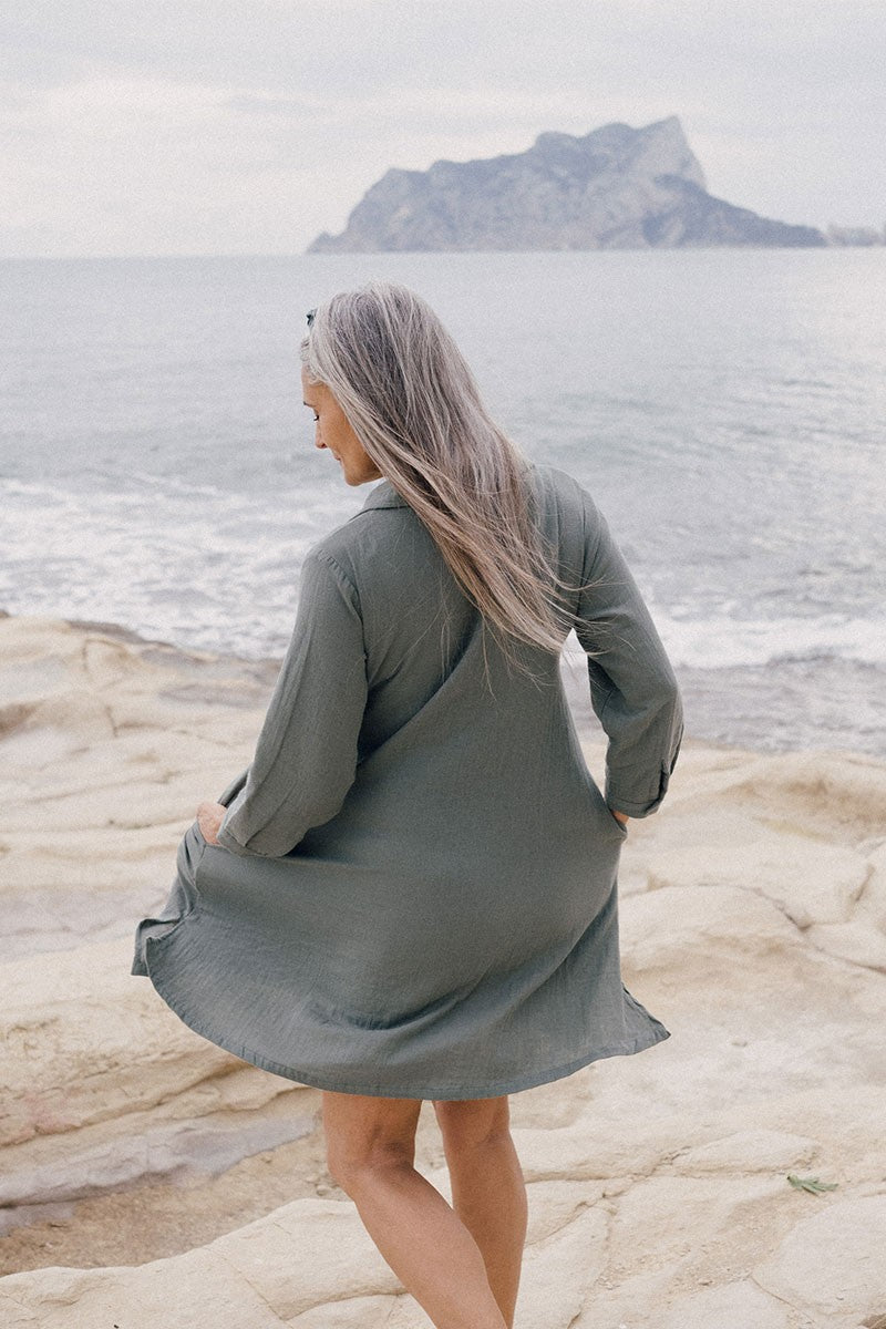 Elisa is a three-quarters sleeve shirt dress in muslin fabric. It has a slit with functional buttons and practical side pockets. It is an elegant and casual model at the same time, you can choose your favourite style! You can wear it as a dress or as a robe with a T-shirt underneath. It is a wardrobe basic in emerald green that you can combine with an infinite number of garments. It is made of muslin fabric, making it very soft and pleasant to the touch.